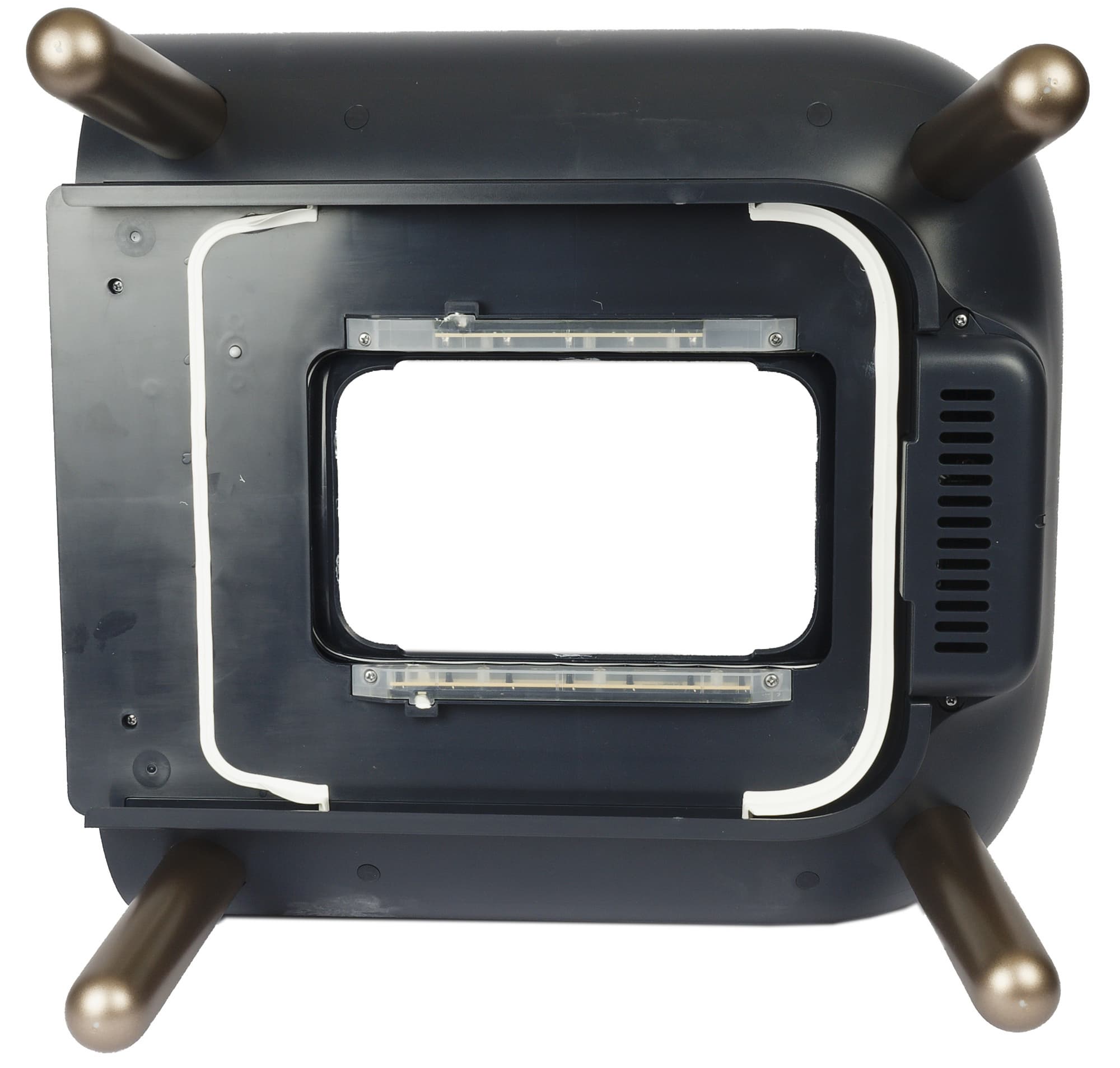 Кубическая форма устройства напомнила нам старые (советские) телевизоры. Они точно так же зачастую стояли на ножках, имели форму куба (правда, у нашего туалета грани скруглены), да и входное отверстие у кошачьего туалета навевает ассоциации с голубым экраном. Таким образом, можно сказать, что туалет хоть и является современным устройством, не будет инородно смотреться и в квартире, оформленной под старину, с использованием старой или даже антикварной мебели.
