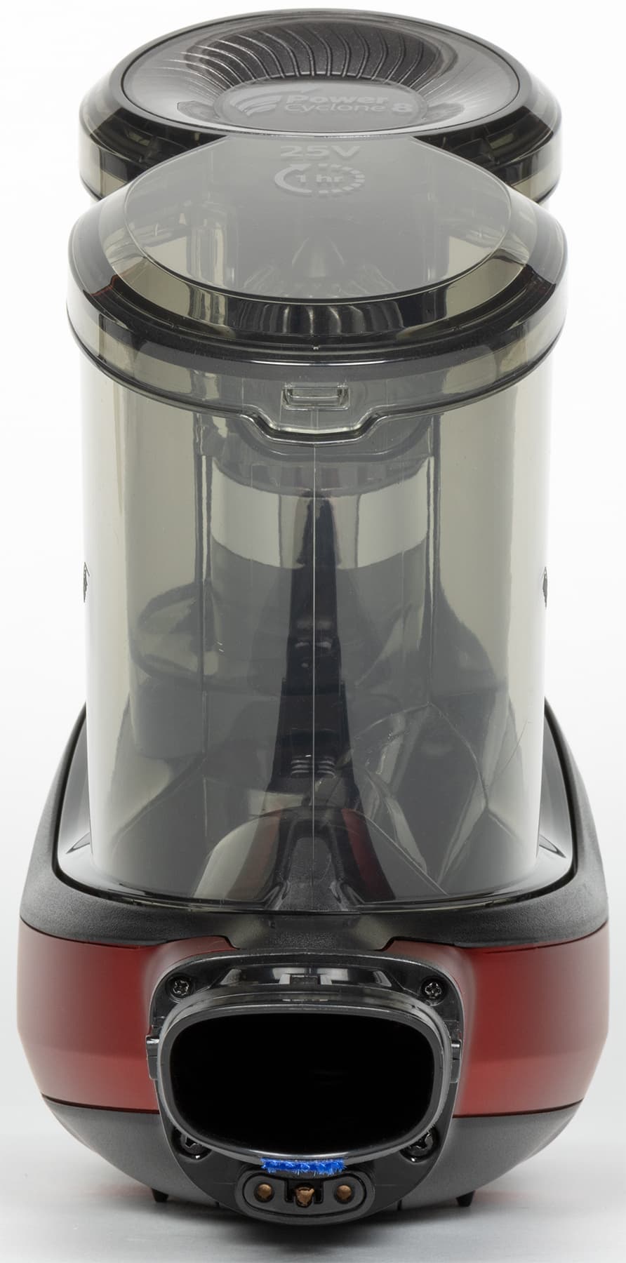 Частицы мусора и пыль выбрасываются в окошко, соединяющее цилиндрические корпуса, и оседают в контейнере мусоросборника, а очищенный воздух поступает в насос, проходит через фильтр тонкой очистки и покидает корпус моторного блока через отверстия в торце.