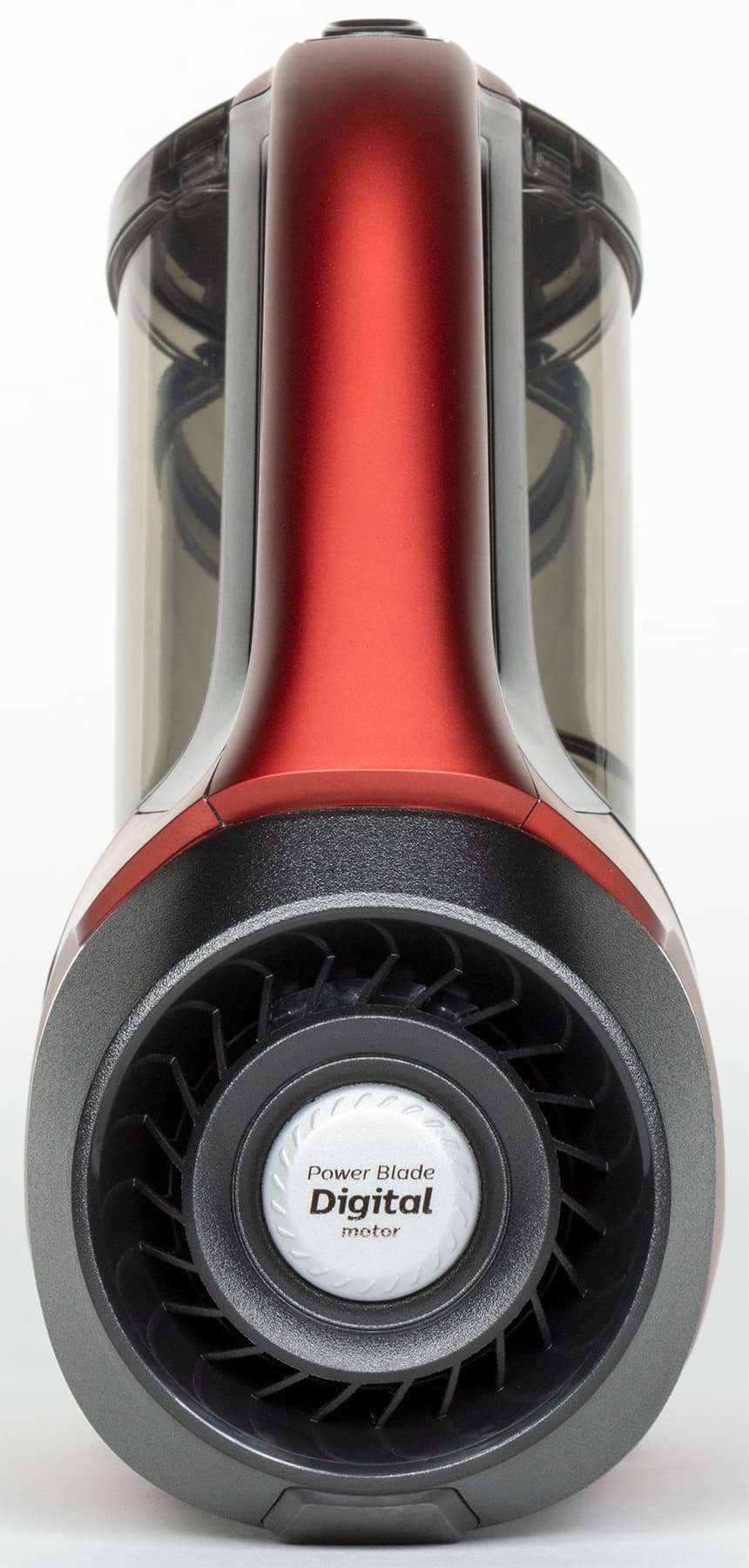 Продольно скомпонованный двигатель прибора располагается на одной оси с воздушным трактом, в задней части моторного блока. Аккумулятор у этой модели несъемный.