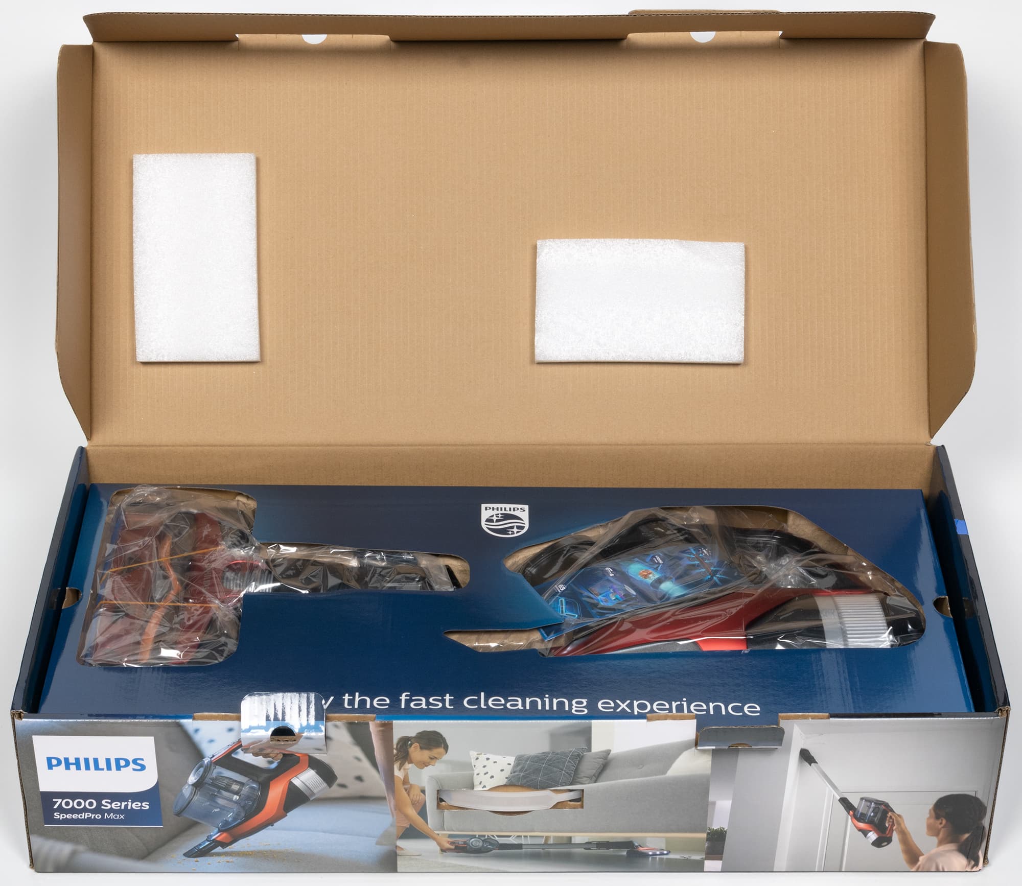 Пылесос и аксессуары закреплены в упаковке с помощью трехмерных конструкций из папье-маше и упакованы в прозрачный полиэтилен.