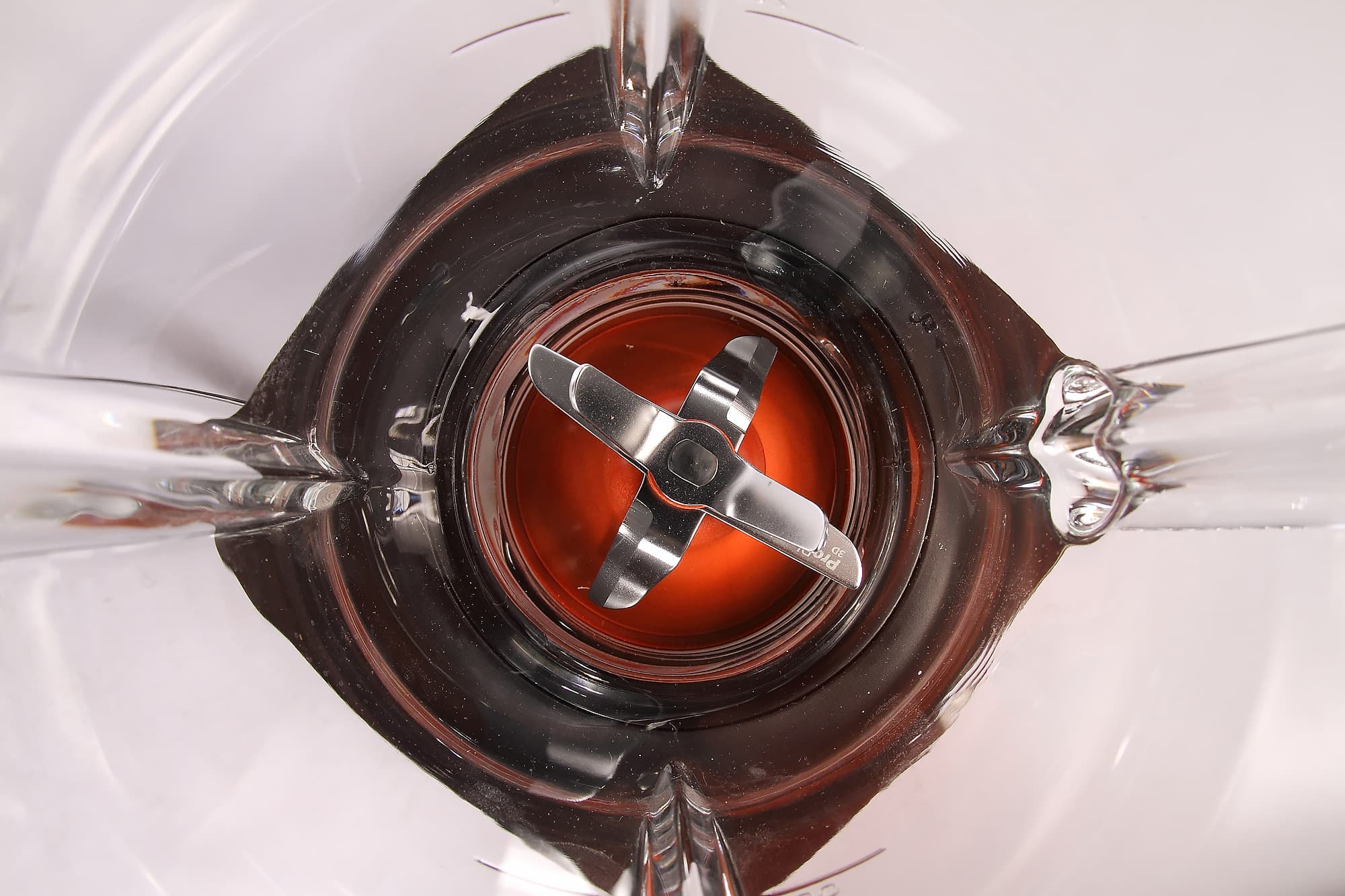 Сам ножевой блок состоит из трех пар ножей, загнутых под разными углами — два загнуты вниз, два вверх, два расположены горизонтально. Нижние «лепестки» имеют дополнительный изгиб. Ничем особым ножи на вид не выделяются: никакой серрейторной заточки и прочих изысков тут нет. Место стыковки с моторным блоком — пластиковое.