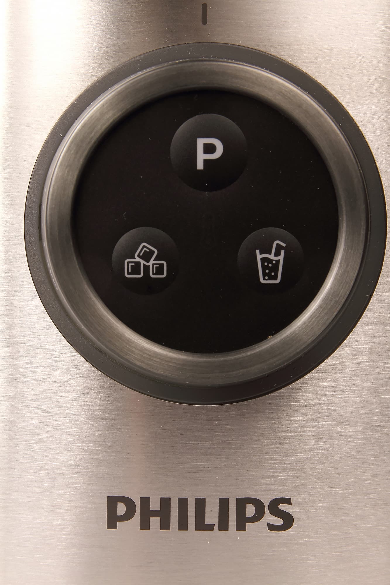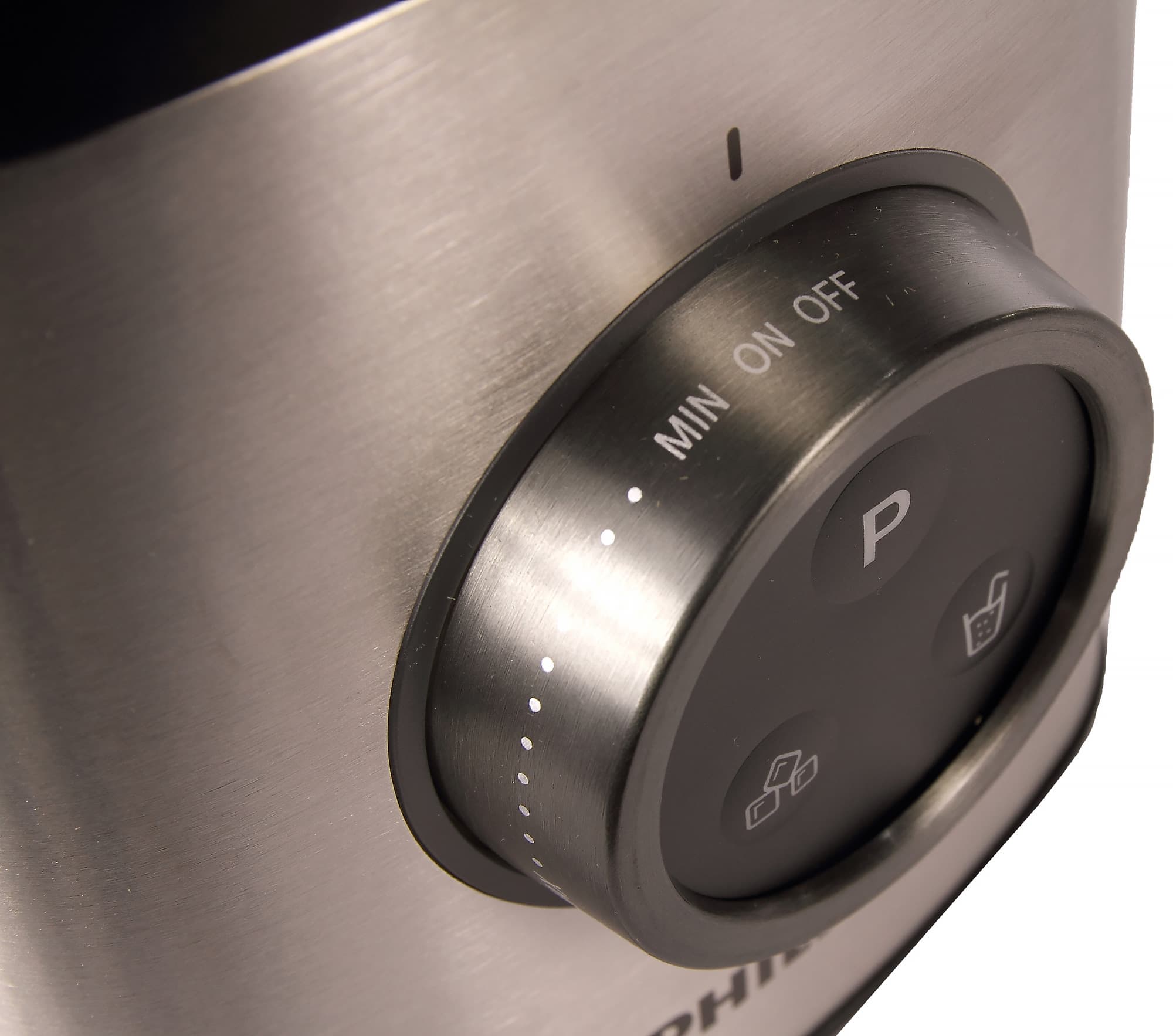 Спереди располагается блок управления — вращающаяся ручка-кольцо для плавной регулировки скорости вращения и три механические кнопки с пиктограммами для запрограммированных режимов.
