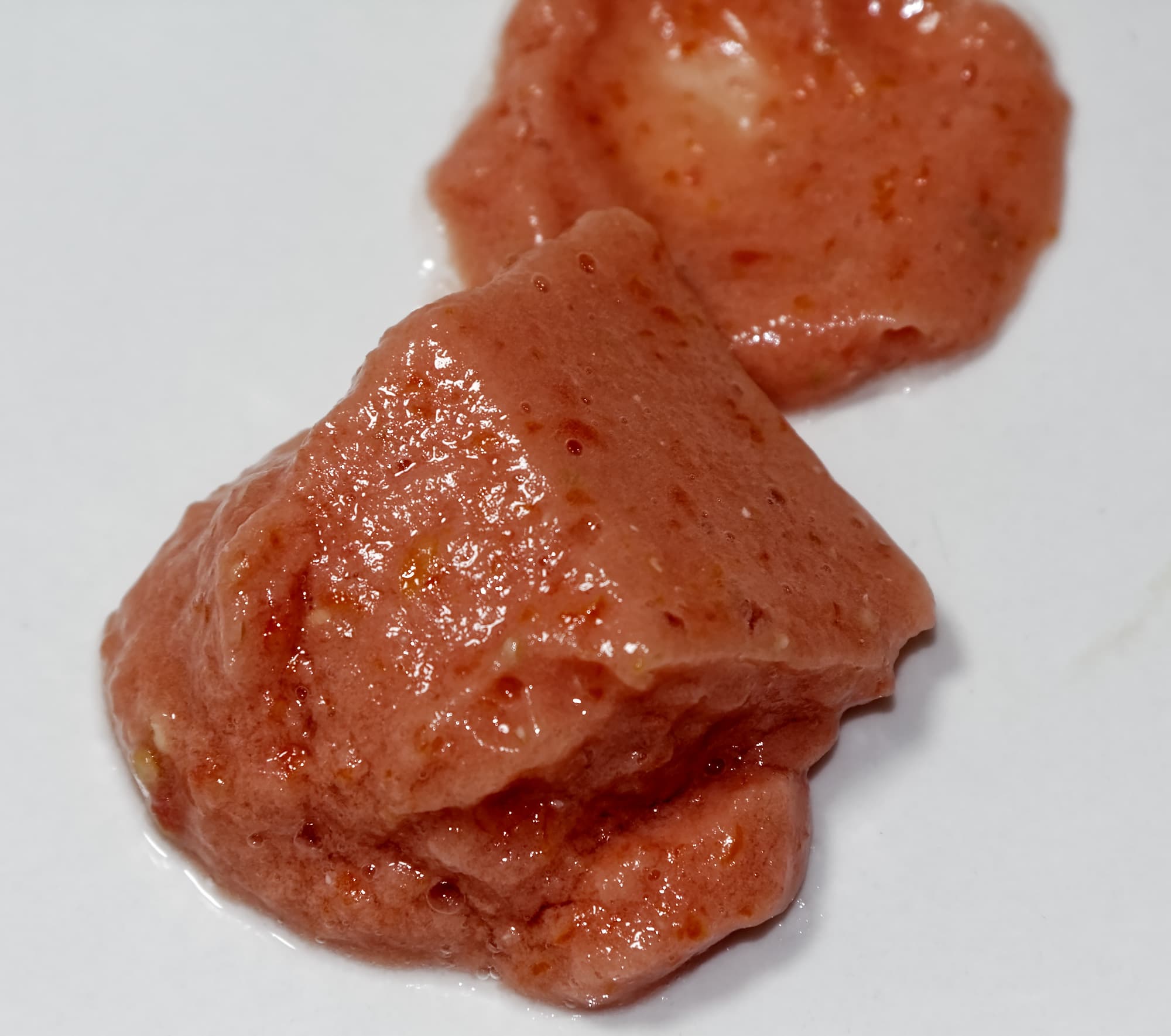 Уже через 30 секунд стало понятно, что блендер справится с задачей на отлично: томаты не только измельчились до состояния однородной массы, но и начали взбиваться в йогуртообразную субстанцию, которая держала устойчивую форму даже если ее переложить ложкой или оставить на несколько дней в холодильнике.