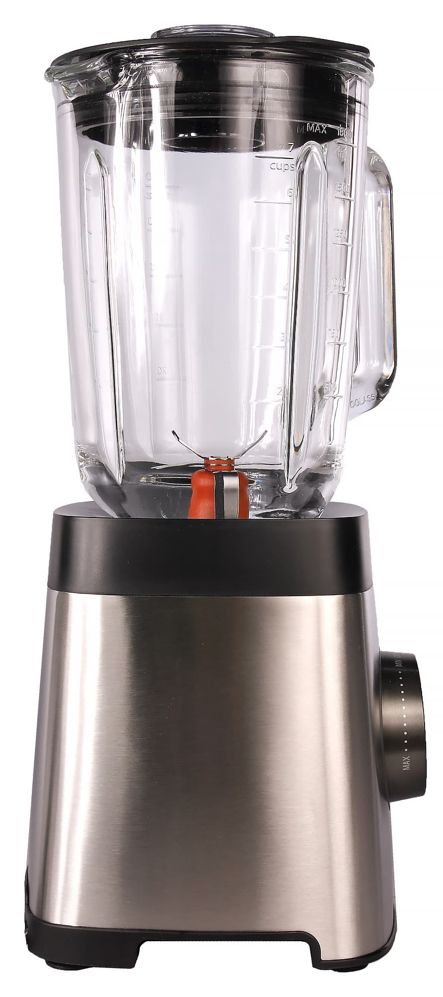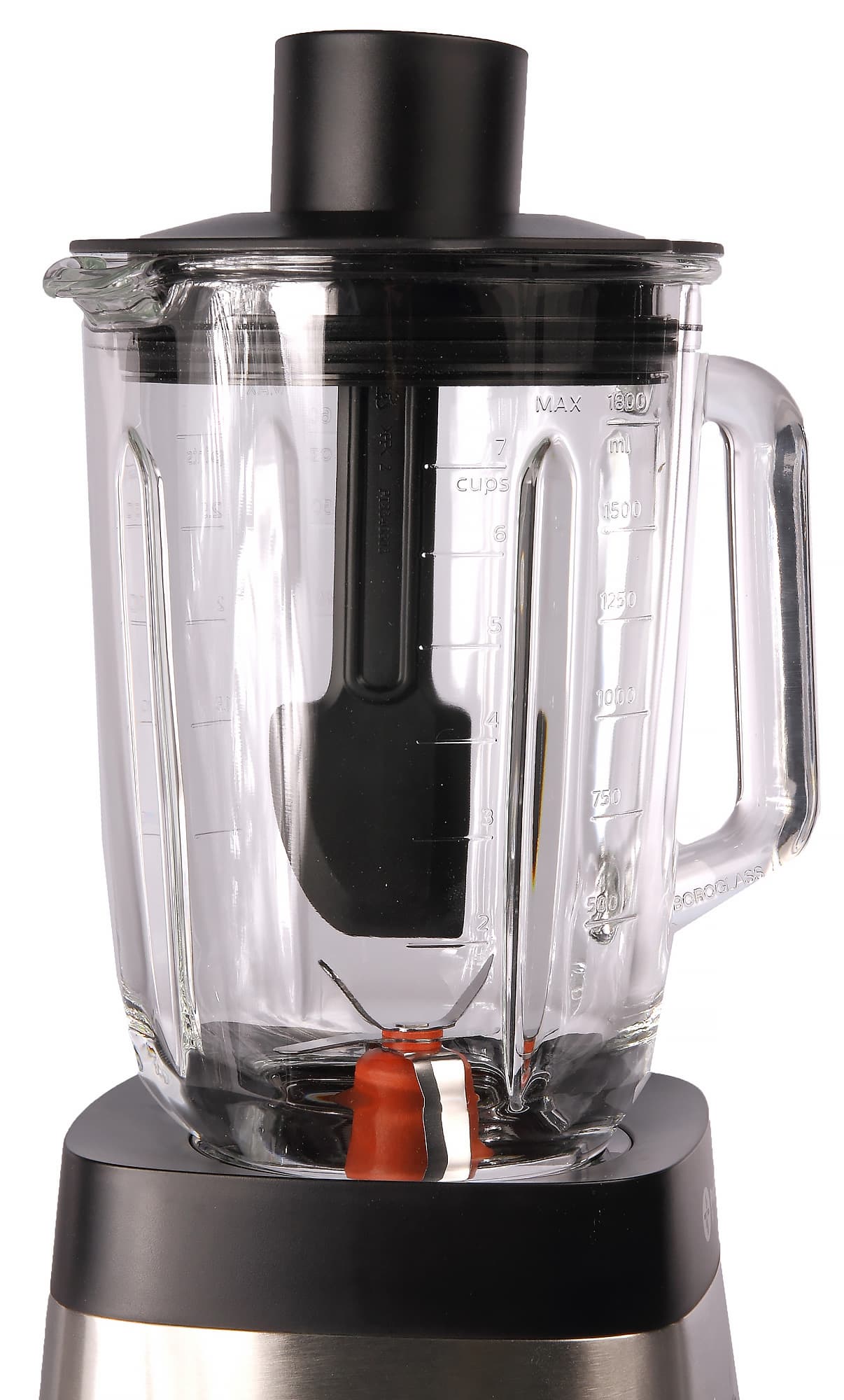 Стеклянный кувшин емкостью 2 литра имеет максимальный рабочий объем в 1,8 л. Именно об этом недвусмысленно намекает нам отметка Max, нанесенная на кувшин. Как и у любого нормального кувшина для блендера, у нашего кувшина есть ручка, носик и градуировка — от 500 до 1800 мл с шагом в 250 мл, от 2 до 7 чашек (с шагом в 1 чашку), от 20 до 60 унций (с шагом в 10 унций) и от 1 до 3 пинт (с шагом в 0,5 пинты).