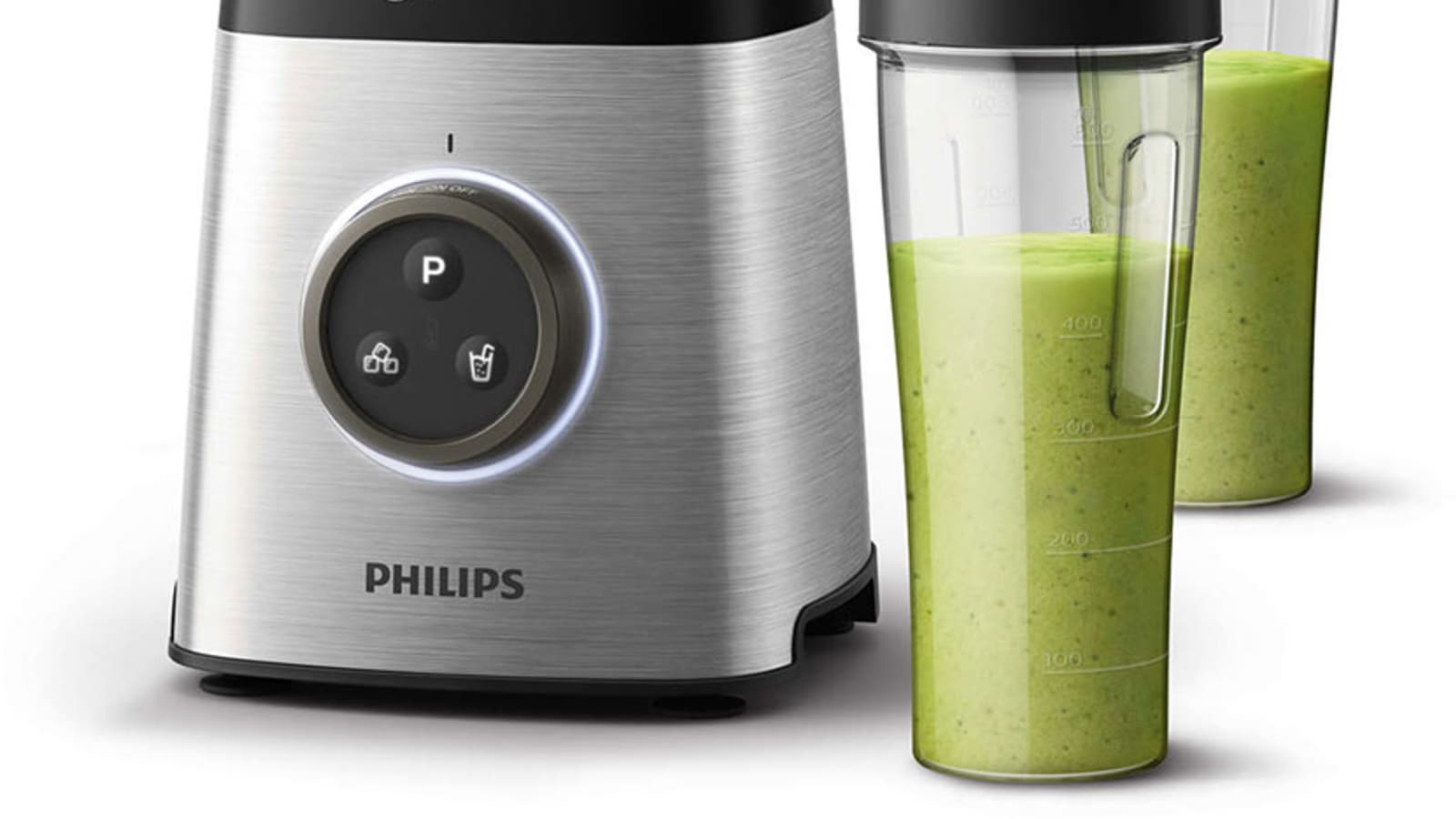 Стаканы имеют градуировку от 100 до 600 мл с шагом в 100 мл и оснащены пластиковой крышкой с отверстием, закрывающимся на защелку. Основная идея Philips заключается в том, что вместо крышки можно установить ножевой блок и, таким образом, приготовить коктейль или смузи сразу в стакане, после чего закрыть его крышкой и убрать в сумку. Решение и в самом деле выглядит здраво: таким образом пользователь оказывается освобожден от мытья кувшина.