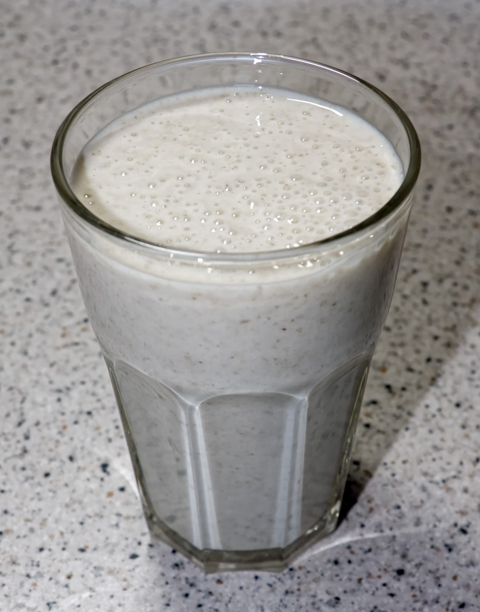 Бананы мы нарезали на крупные куски, добавили крупные овсяные хлопья, добавили кефир. Измельчали на программе «Смузи» в течении одной минуты, хотя, на наш взгляд было достаточно и 20-30 секунд. Готовый смузи оказался однородным, воздушным, с большим количеством воздушных пузырьков.