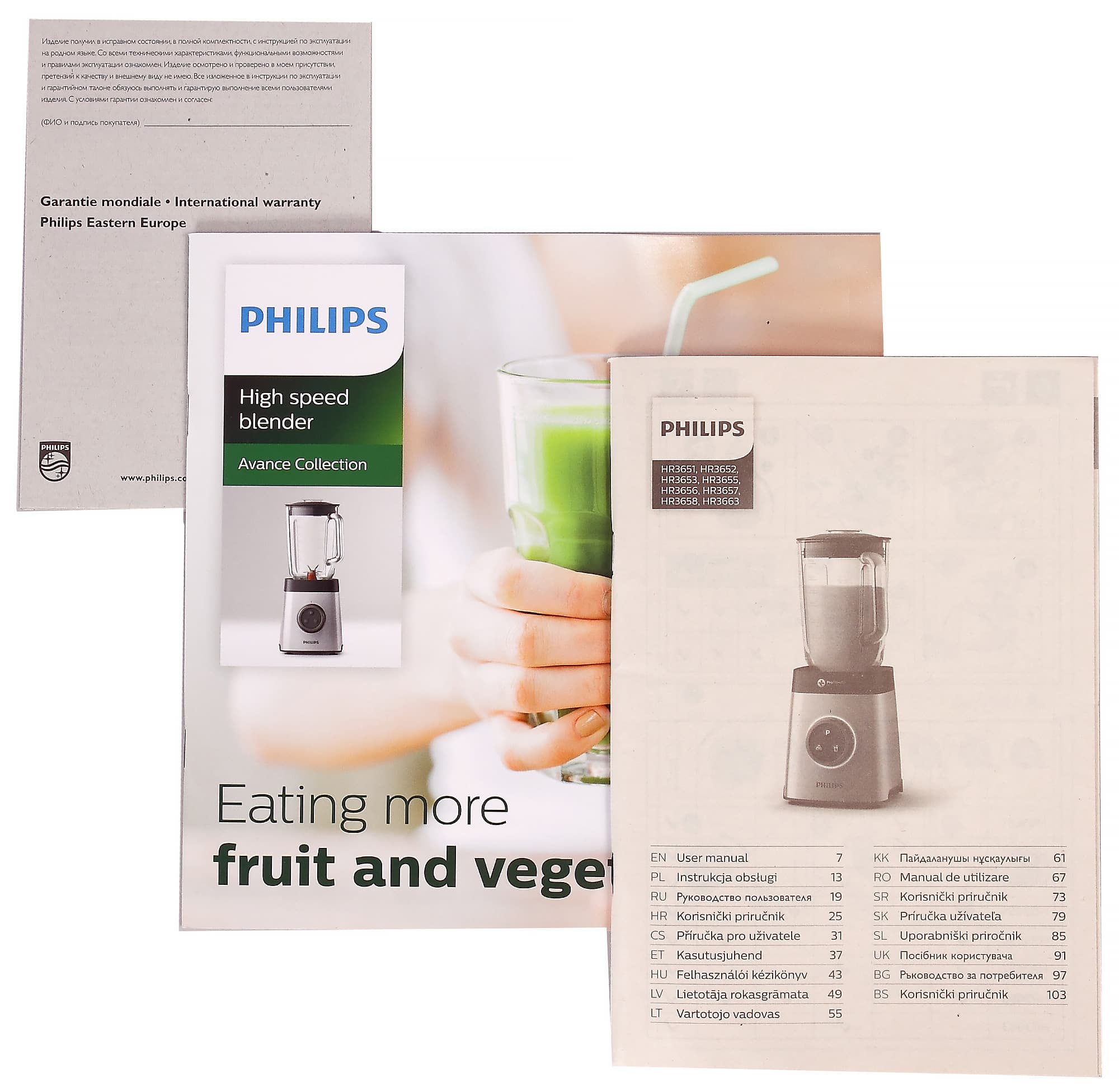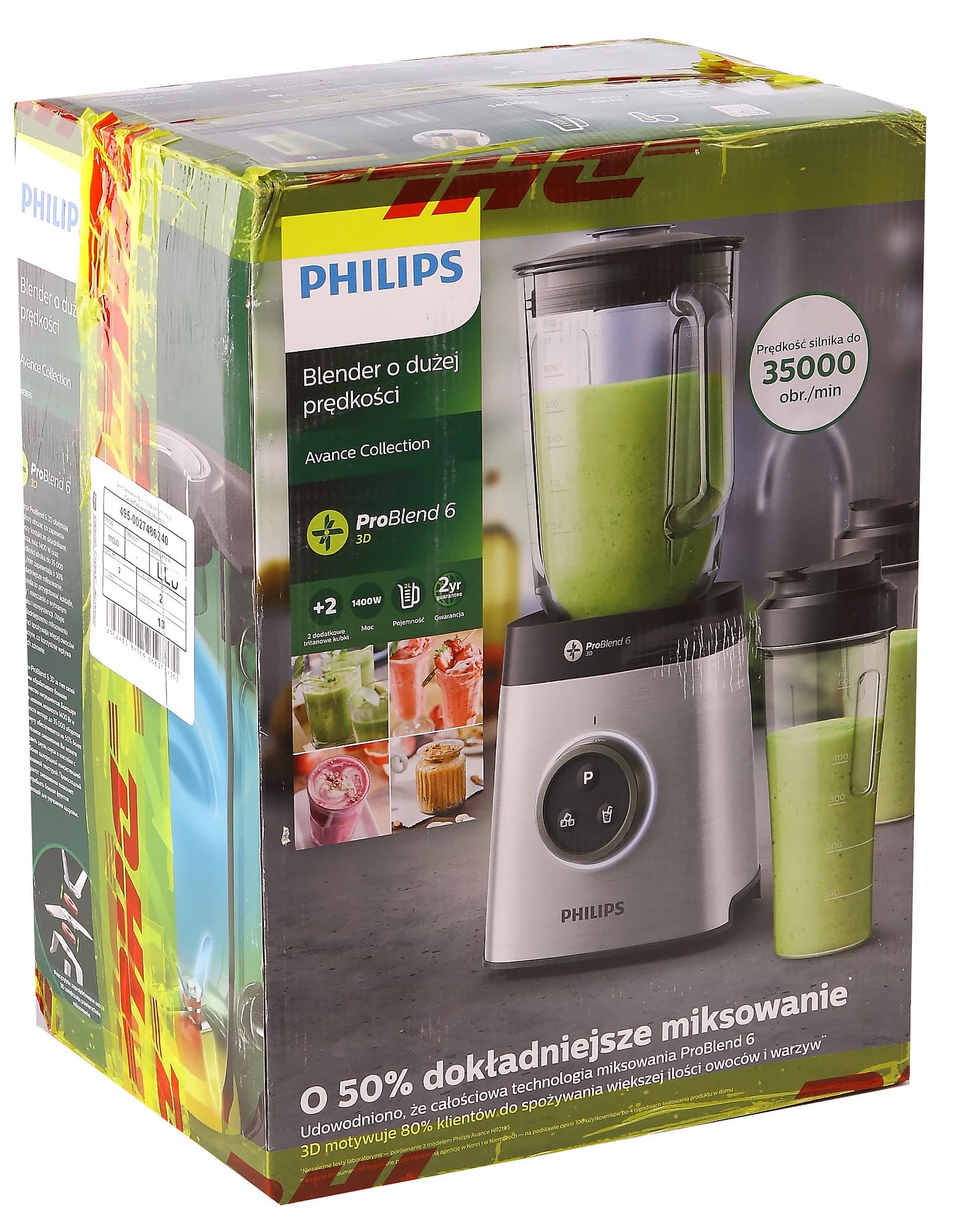 Блендер поставляется в картонной коробке, оформленной с применением полноцветной печати. Основной цвет оформления — зеленый. Судя по всему, это должно подчеркнуть «экологичность» блендера. Косвенно об этом говорит и тот факт, что производитель особенно подчеркивает тот факт, что блендер раскрывает пользу питательных веществ и позволяет включить в свой рацион больше фруктов и овощей.