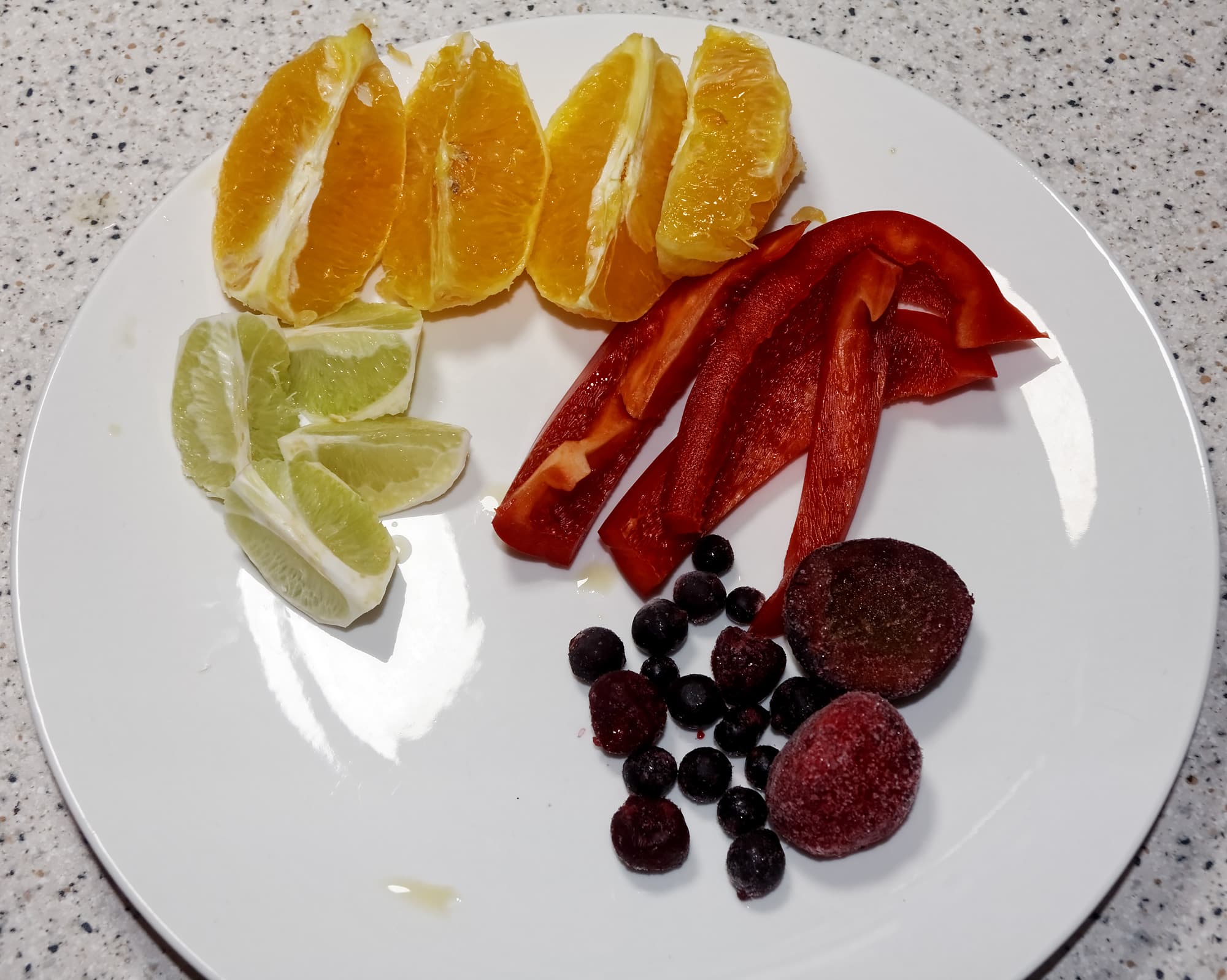 Для приготовления этого напитка из книги рецептов нам понадобилось: 200 мл воды, 200 мл йогурта, один красный болгарский перец, замороженная вишня (24 шт.), один апельсин, один лайм.