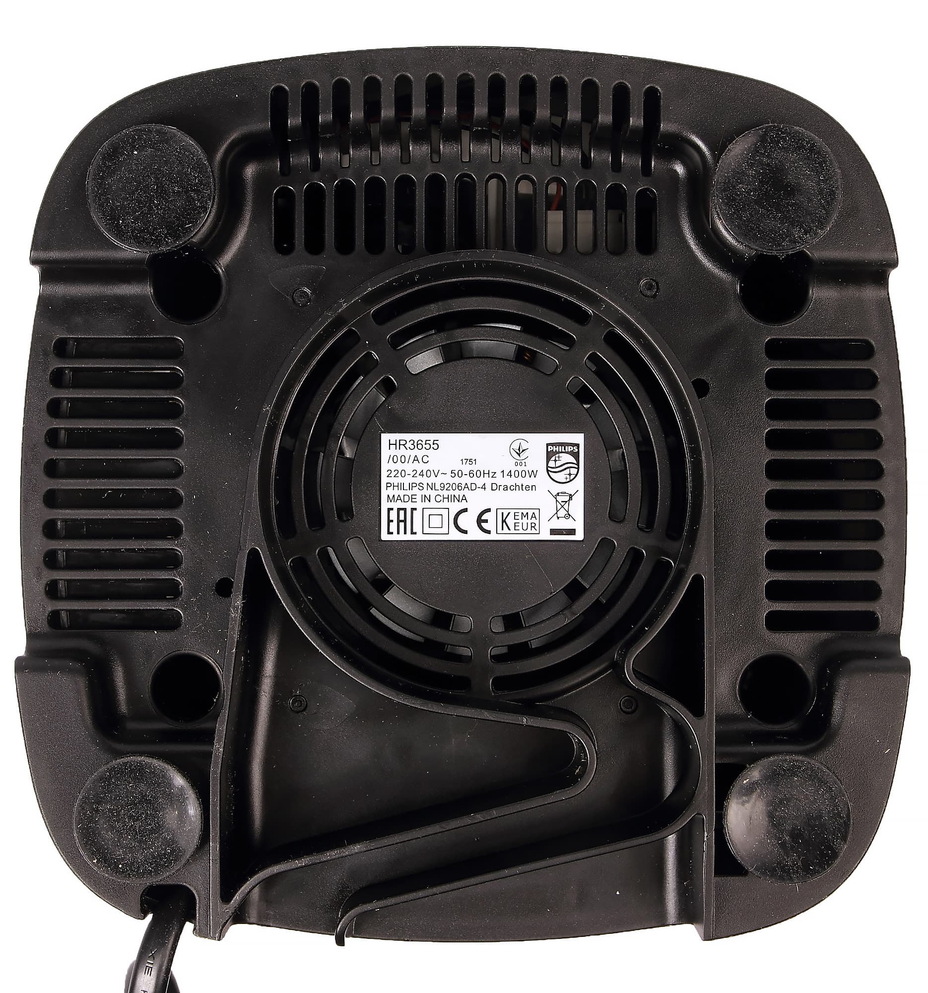 Моторный блок — сердце блендера — практически полностью закрыт металлическим листом. Пластик виден лишь в верхней части и на дне. Снизу у блендера можно увидеть четыре присоски и вентиляционные отверстия, за которыми прячется вентилятор охлаждения. Тут же находится наклейка с информацией об устройстве и отсек для хранения шнура, позволяющий спрятать его излишки внутрь корпуса (на наш взгляд, не слишком удобный).