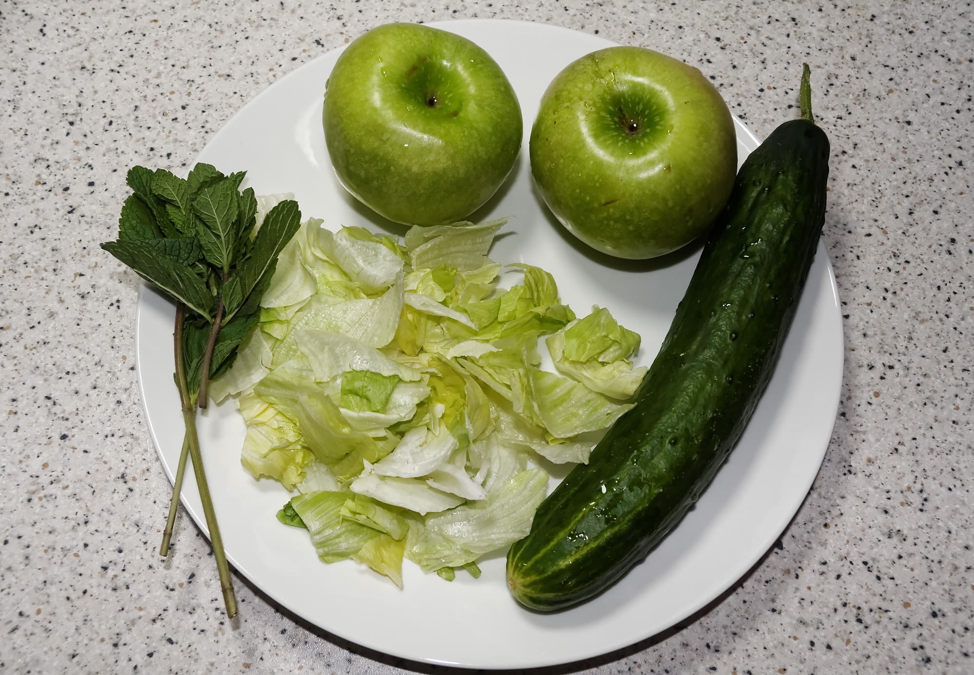 Для приготовления этого смузи нам понадобились следующие ингредиенты: 100 мл воды, 300 мл йогурта, 200 г салата айсберг, один огурец, два зеленых яблока без сердцевины, несколько листьев мяты для украшения.