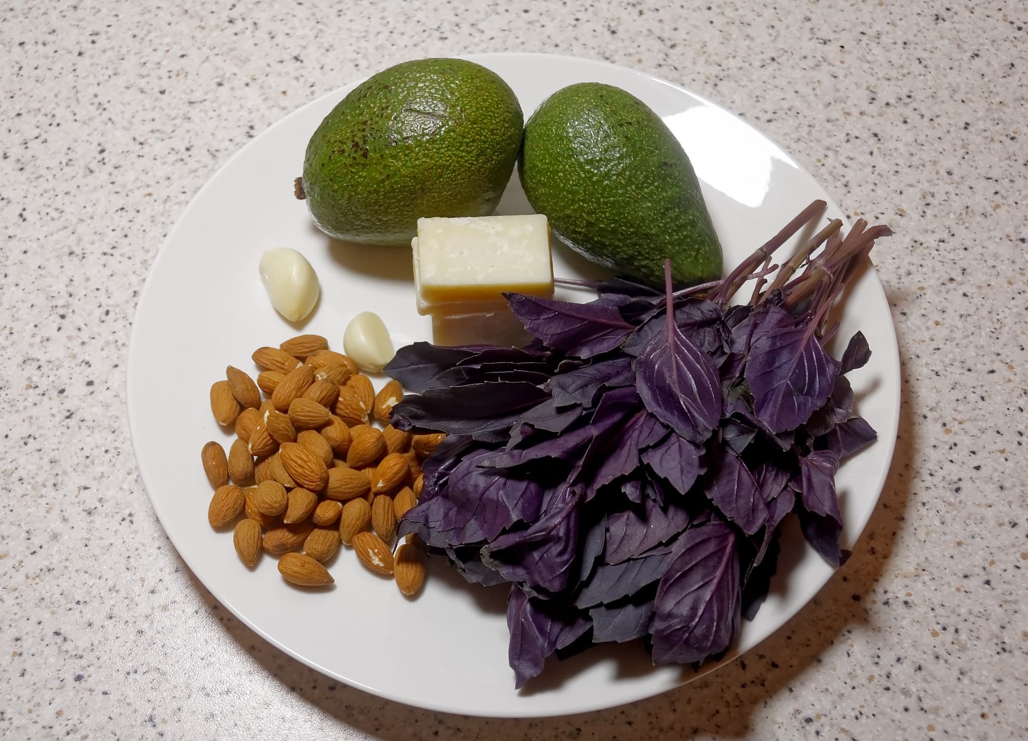 Для приготовления авокадо мы воспользовались рецептом из прилагаемой книги. Нам понадобилось: 50 г миндаля или кешью, чеснок — 2 зубчика, свежий базилик — 2 пучка, оливковое масло — 50 мл, спелые авокадо — 4 шт., пармезан — 60 г, соль и перец по вкусу.