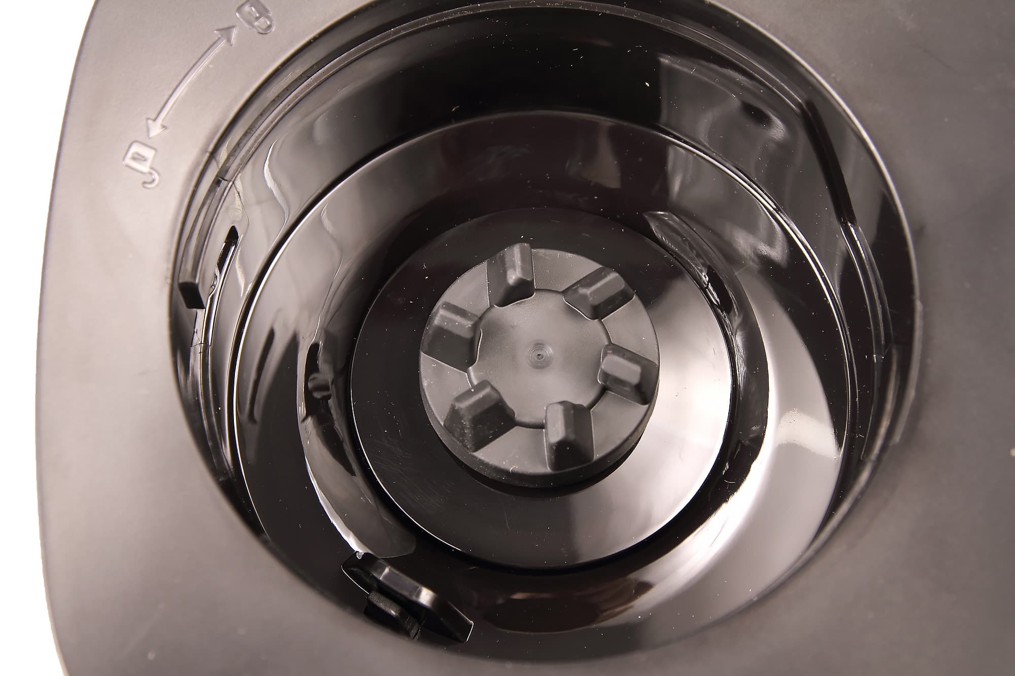 Сверху можно увидеть байонет для кувшина с иконкой, поясняющей порядок его установки, а также кнопку защиты, не позволяющую включить блендер без установленного кувшина.