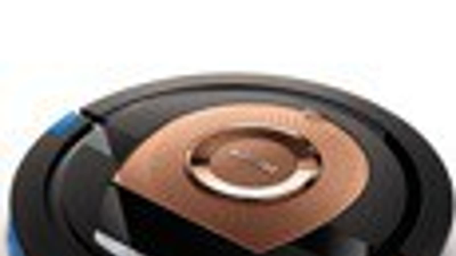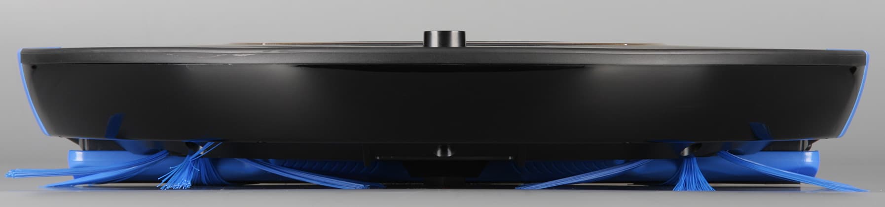 Ближе к передней части корпуса находится вставка из полупрозрачного тонированного пластика с зеркально-гладкой поверхностью, за которой расположены два значка состояния (ошибки и заполнения пылесборника), подсвечиваемые светодиодами. А сразу позади бампера есть единственная механическая кнопка с подсвечивающимся синим значком питания. Всю переднюю половину корпуса огибает подпружиненный бампер с небольшим ходом. Цилиндрический выступ сверху на бампере является самой высокой частью пылесоса и, соответственно, определяет минимальный просвет препятствия (например, дивана), под которое пылесос еще может забраться. Согласно нашим измерениям этот просвет равен 61 мм (приведем и полученное значение диаметра робота — 350 мм). Этот выступ является частью кругового датчика поиска базы и, возможно, приемника сигналов с пульта ДУ. Нижняя часть бампера изготовлена из прозрачного плотно тонированного пластика, который прикрывает ИК-датчики препятствий.