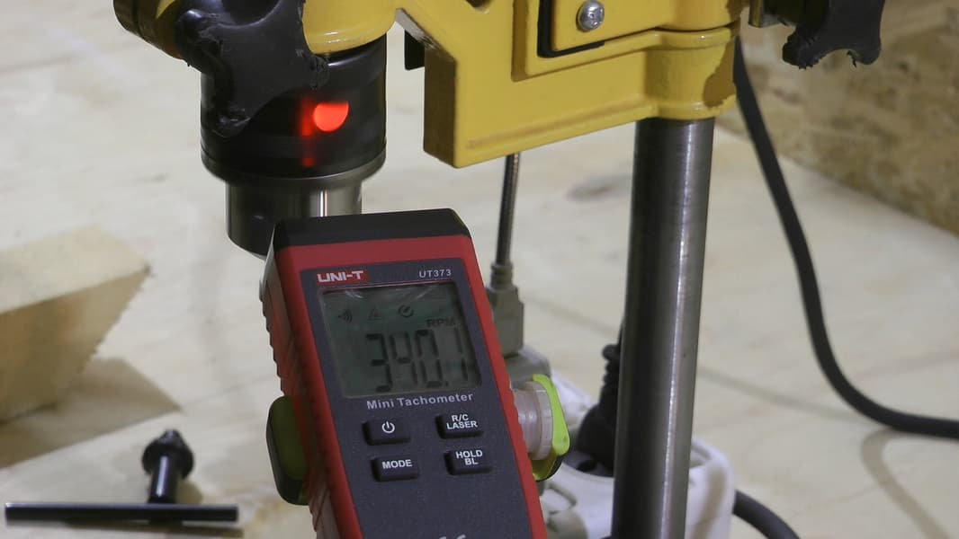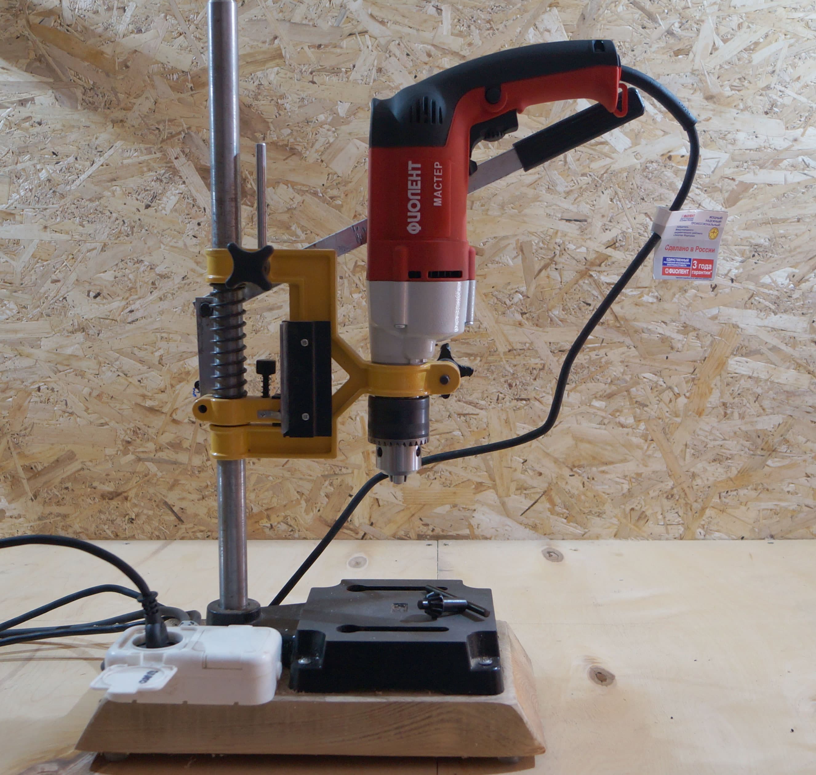 В случае с металлом мы не услышали даже намека на изменение скорости вращения, хотя усердно нажимали на рычаг стойки (дрель допускает нажатие на сверло до 100 ньютонов — около 10 кгс). Большинство бытовых электродрелей в таком случае наверняка бы «зависли», а сверло выкрутилось бы из патрона. Но рассматриваемая дрель ведет себя как настоящий сверлильный станок.