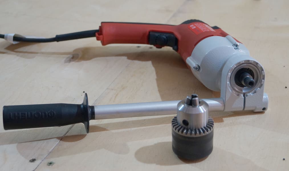 Габариты инструмента близки к размерам всех современных проводных дрелей. Неширокий корпус — это огромный плюс, ведь он позволяет использовать дрель на стойке. Однако погодите со стойкой. Да и с рукоятью нужно повременить, с фотографиями мы чуток поспешили. Дело в том, что диаметр гигантского (по бытовым меркам) патрона, который навинчен на дрель, составляет 50,5 мм. В то время как диаметр шейки металлического корпуса дрели равняется всего лишь 43 мм. И как предлагается надеть на дрель рукоять или установить инструмент на стойку? В руководстве ни полслова не уделено этому секрету.
