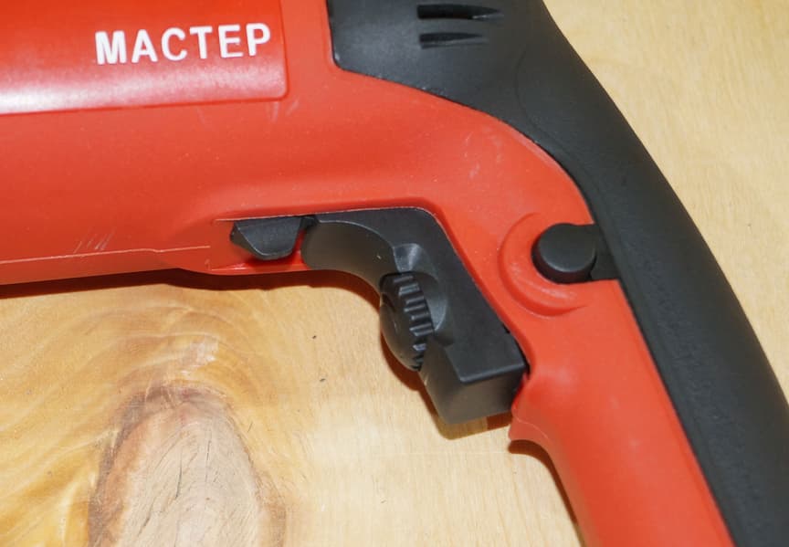 Режим работы у дрели всегда один — сверление в единственном диапазоне скоростей. Правда, имеется возможность изменить направление вращения шпинделя. Это потребуется для того, чтобы высвободить оснастку, застрявшую в материале. Изменение направления осуществляется перекидыванием флажка, который расположен над главным рычагом пуска.