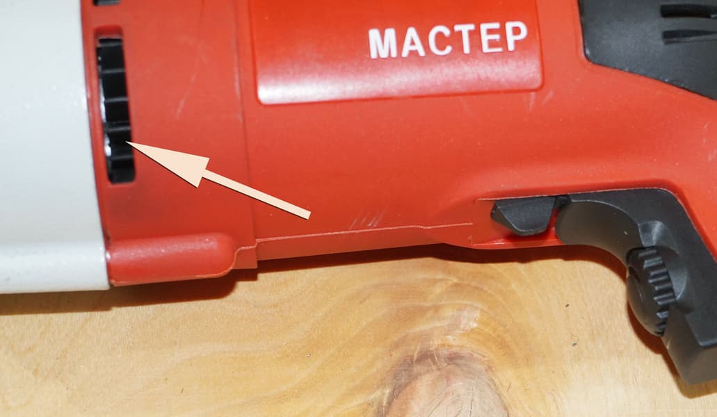 В щелях виднеются края лопастей. Это крыльчатка охлаждения, которая насажена на якорь двигателя. Вращается она гораздо быстрее шпинделя с патроном, ведь вращение с двигателя на шпиндель передается через шестерни понижающего редуктора. А значит, если аккуратно вставить между лопастей тонкую отвертку, шпиндель дрели будет намертво заблокирован, и патрон можно легко открутить с помощью того же ремешкового ключа. Только мы вам этого не говорили.