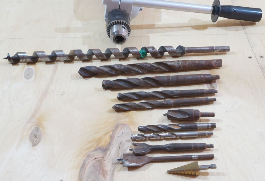 Еще несколько слов о патроне. Почему в сверлильных машинах используются только кулачковые патроны, а не быстрозажимные? Потому, что в профессиональной работе быстрозажимной патрон — это абсолютно неприемлемый способ крепления оснастки. В серьезной работе используется только кулачковый патрон, лишь с его помощью любое сверло можно закрепить достаточно надежно. Еще один плюс кулачковых патронов заключается в том, что форма хвостовика оснастки почти не играет роли. Подойдет любая, даже та, которая давно не используется в промышленности или в быту. Например, любое сверло, представленное на следующем фото, вполне годится для патрона нашей дрели. Но есть хитрость: для надежной фиксации оснастки желательно зажимать ее, устанавливая ключ поочередно в каждое из трех отверстий патрона.