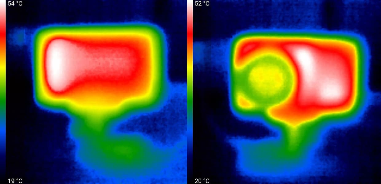 Во время длительной работы корпус аппарата ощутимо нагревается. Ниже приводятся тепловизионные снимки прибора, сделанные после нескольких часов непрерывной видеозаписи с работающим дисплеем. Питание регистратору подавалось стационарное, тестирование проводилось в комнатных условиях при температуре окружающего воздуха около 22 °C.