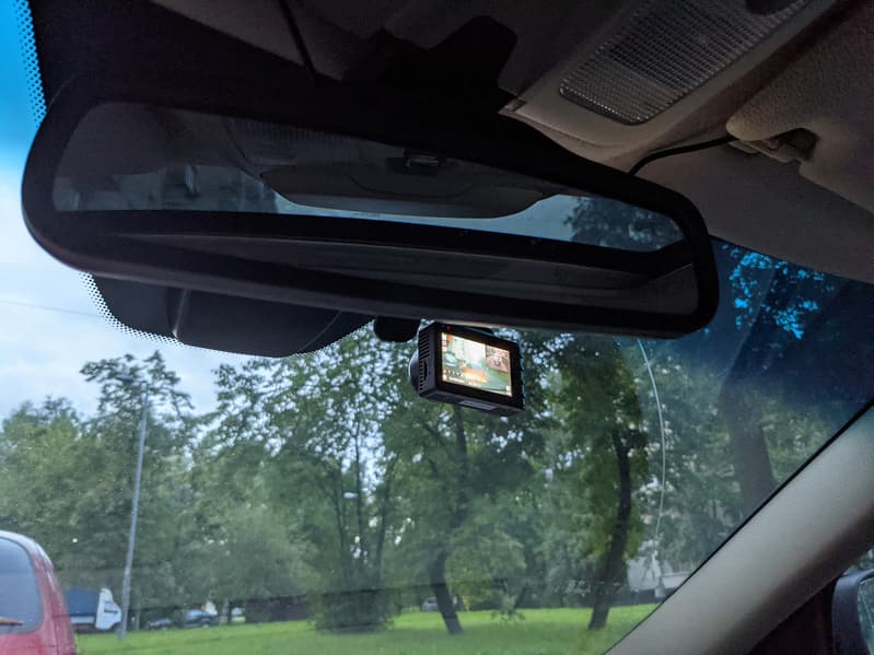 В таком положении экран регистратора водителю виден плохо — его перекрывает зеркало. Но так как при нормальной эксплуатации смотреть на него приходится крайне редко, мы решили смириться с этим неудобством. При необходимости пометить запись для защиты от удаления это можно сделать и на ощупь.