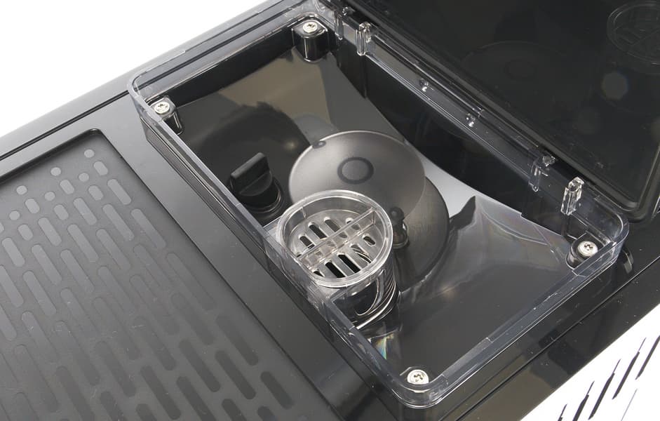Рядом с заварочным блоком устанавливается пластиковый отсек для отработанных кофейных зерен, который вмещает около 8-10 таблеток (отработанных порций). На нем присутствует датчик-магнит, позволяющий кофемашине понять, правильно ли установлен отсек.