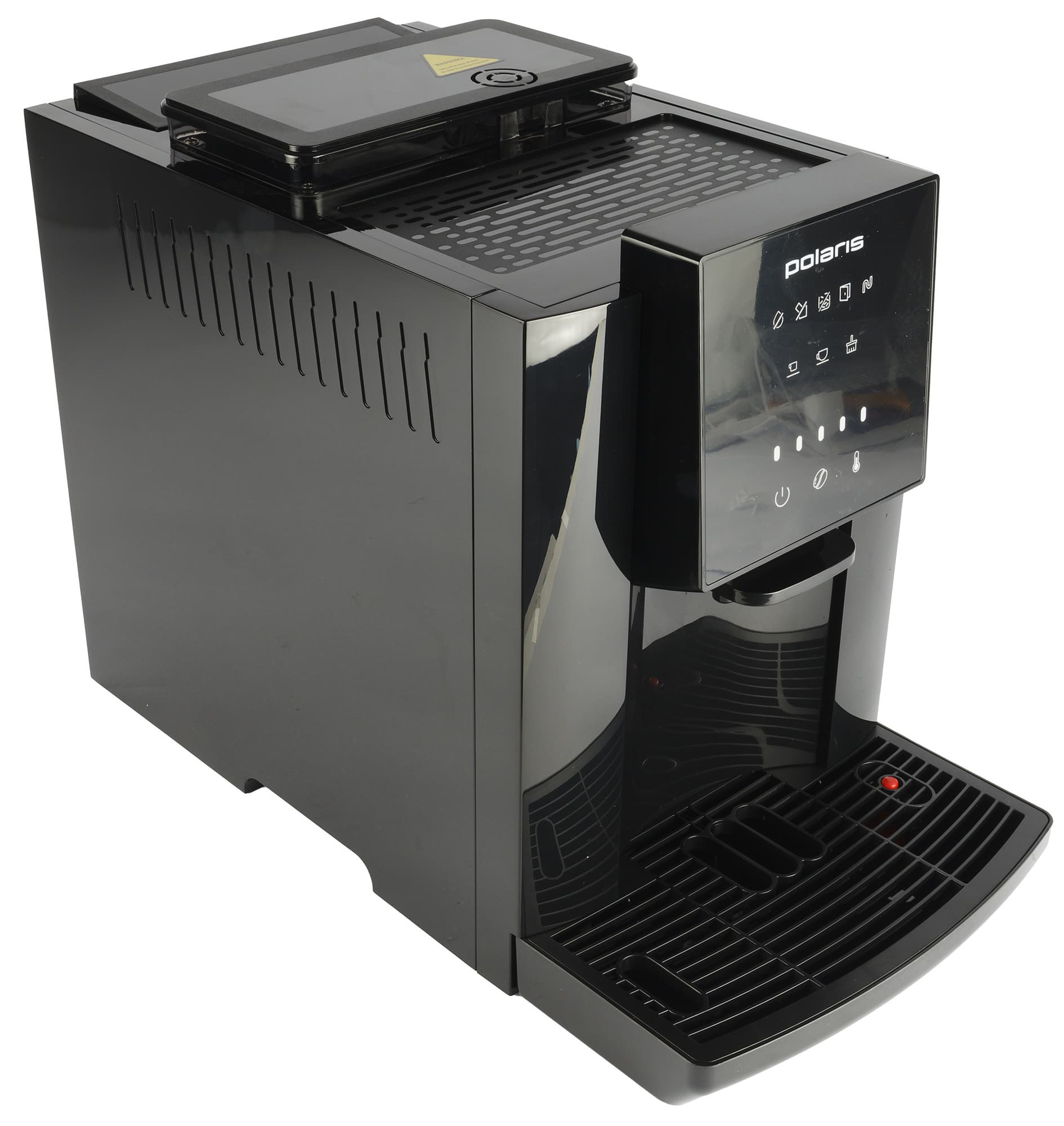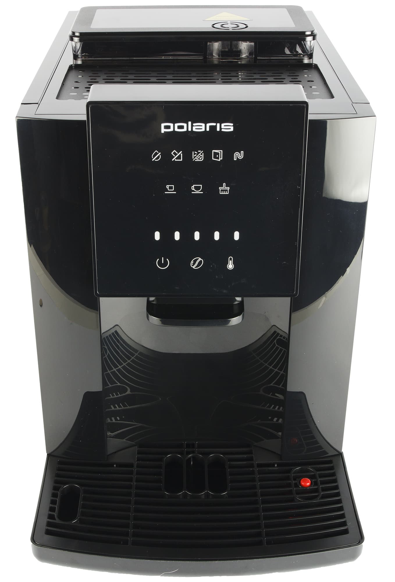 Кофемашина поставляется в объемной картонной коробке, оформленной в фирменном стиле Polaris. Печать на коробке полноцветная. Дизайн строгий: черный фон, небольшое количество ярких элементов, спереди — полноцветная фотография устройства. На боковых гранях находятся расширенная информация, а также перечислены основные характеристики устройства. Боковые ручки для переноски имеются, что немаловажно при таких габаритах и не самом маленьком весе.
