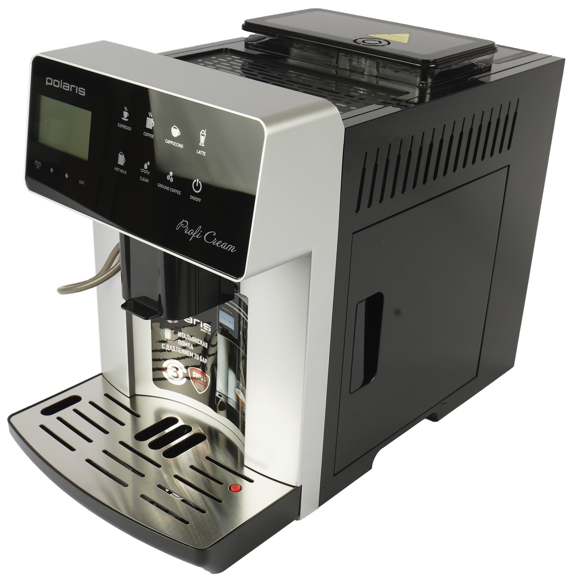 Кофемашина поставляется в объемной картонной коробке, оформленной в фирменном стиле Polaris. Печать на коробке полноцветная. Дизайн строгий: черный фон, небольшое количество ярких элементов, спереди — полноцветная фотография устройства. На боковых гранях находятся кофейных напитков, а также перечислены основные характеристики кофемашины.