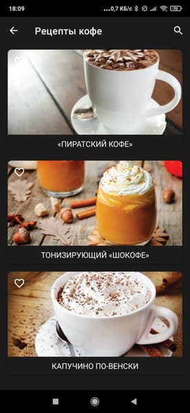 - посмотреть рецепты всевозможных напитков и коктейлей на основе кофе (и сразу же запустить приготовление нужного кофе)
