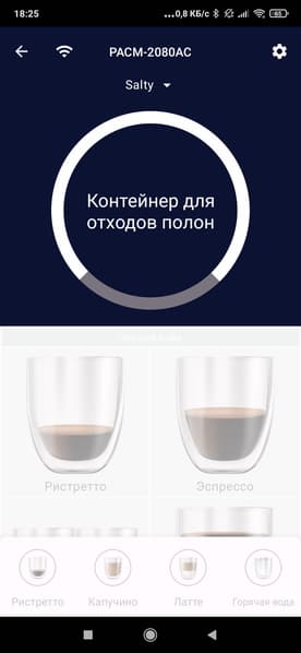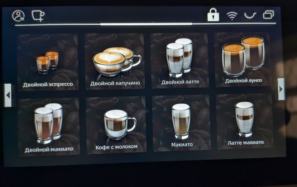 На основных экранах мы можем запустить приготовление любого из имеющихся рецептов, включающих в себя эспрессо, американо и всевозможные молочные напитки.