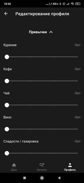 При создании и редактировании профиля можно указать не только имя и фамилию, но также дату рождения. А заодно — поделиться с кофемашиной своими пагубными пристрастиями — рассказать, часто ли вы курите, выпиваете, объедаетесь сладким и т. п.