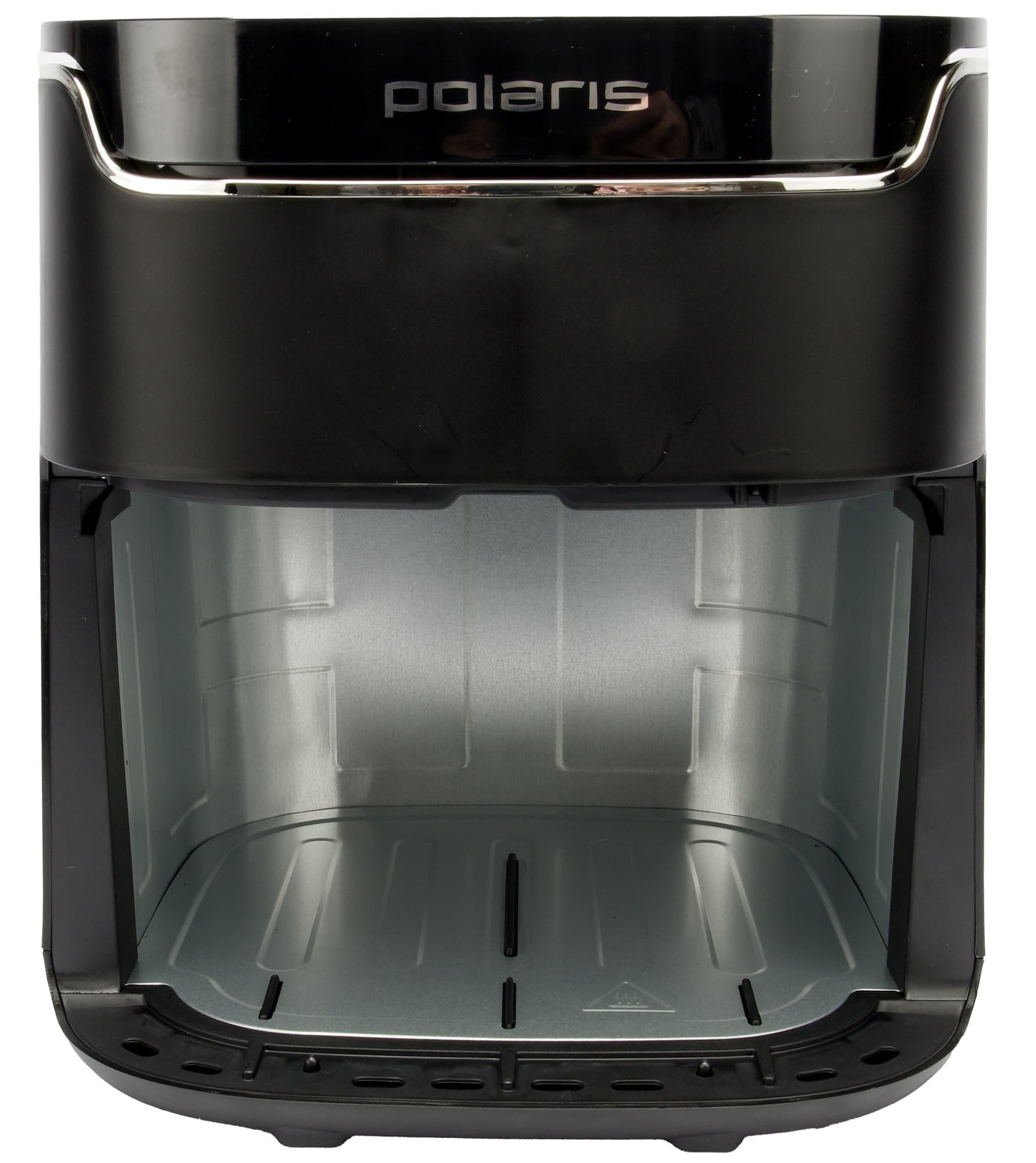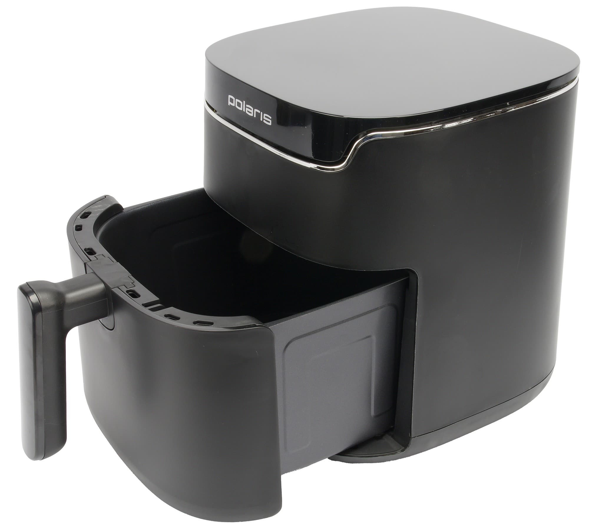 Polaris PAF 5502 имеет классические для современных аэрогрилей конструкцию и дизайн. Перед нами лаконичный стильный корпус с обтекаемыми формами, большую часть которого занимает рабочая камера с выдвигающейся чашей.