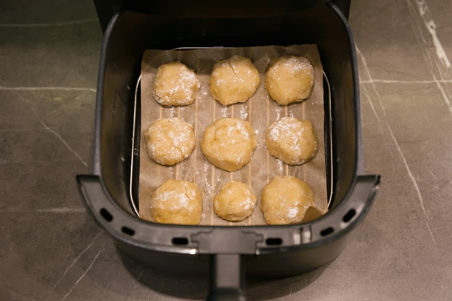 Из плотной массы сформировали будущие печенья, обваляли в сахарной пудре и выложили на решетку-гриль, предварительно застеленную пекарской бумагой.