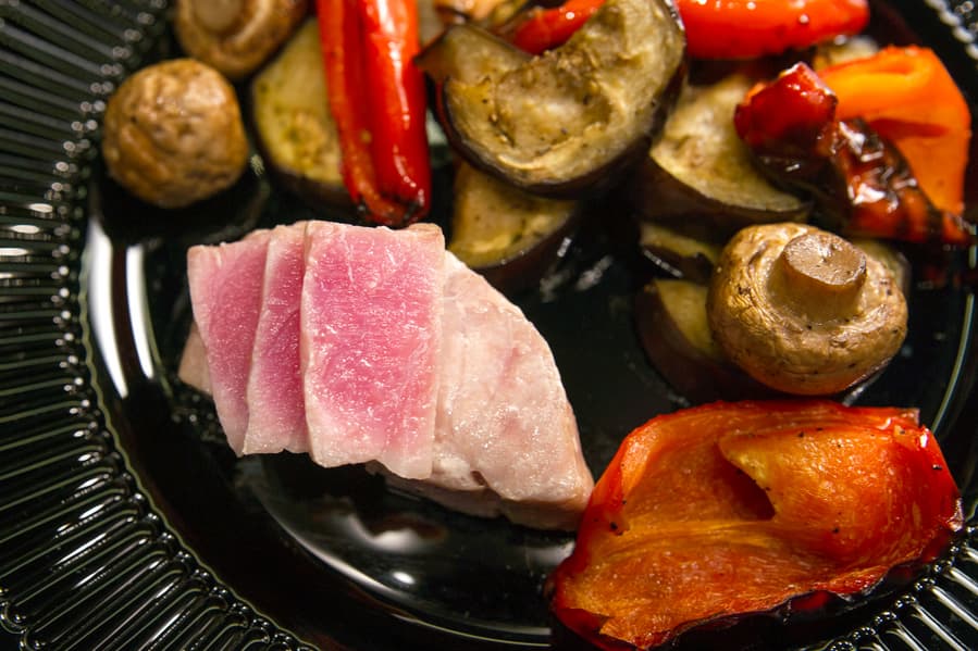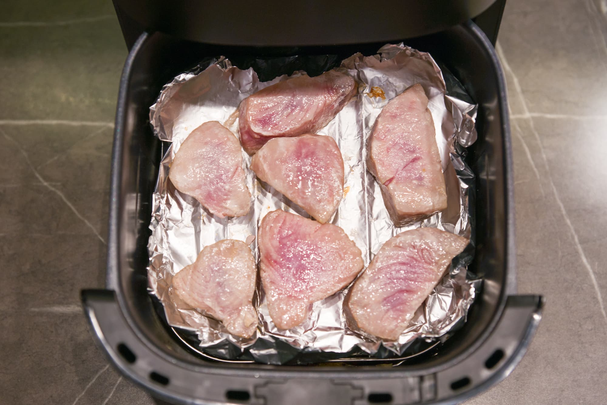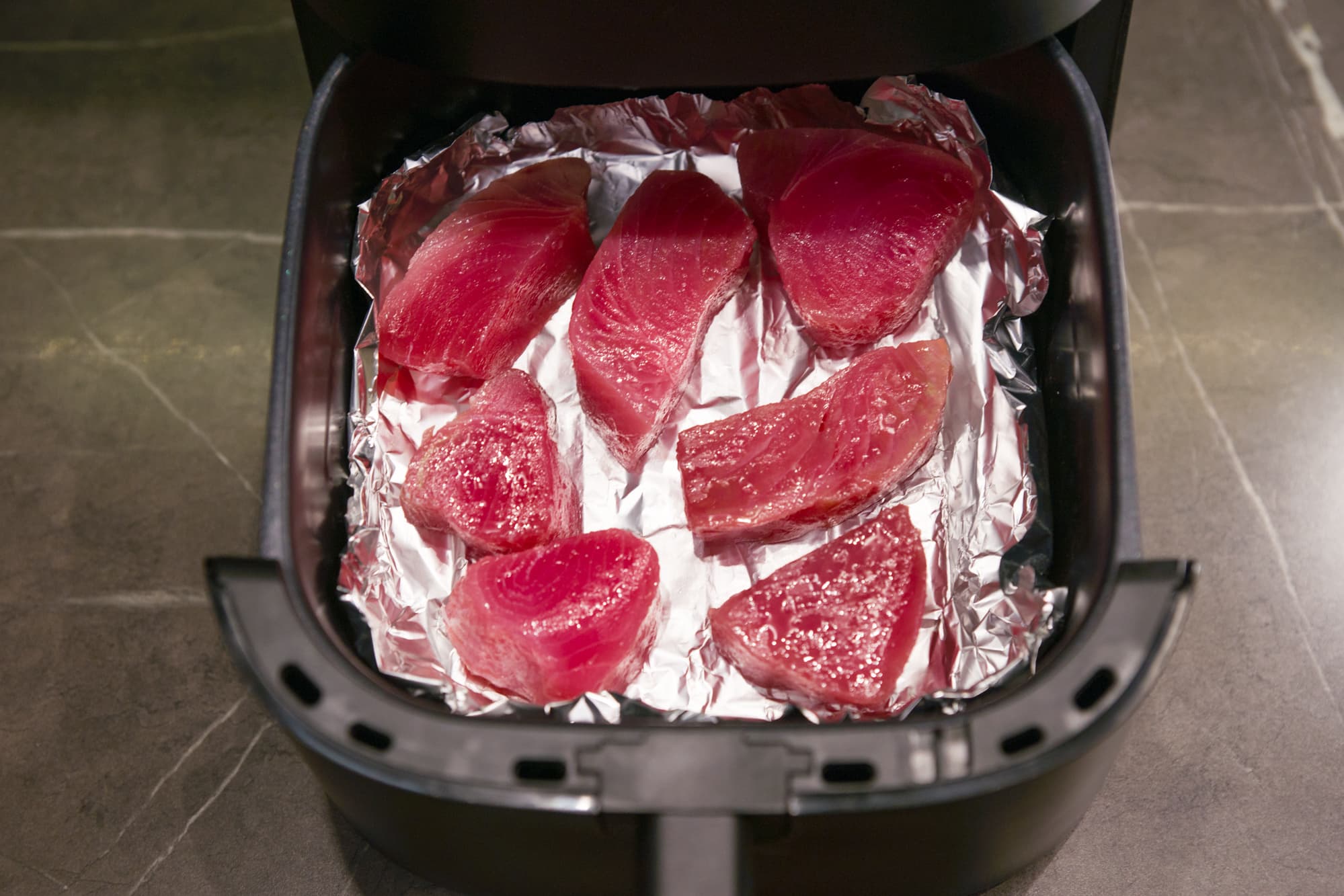 Еще через 5 минут снова достали чашу, установили решетку на ножках над овощами (к этому моменту они уменьшились в объеме, так что трудностей не возникло), уложили сверху фольгу, а на нее — кусочки тунца, смазанные маслом и присыпанные солью.