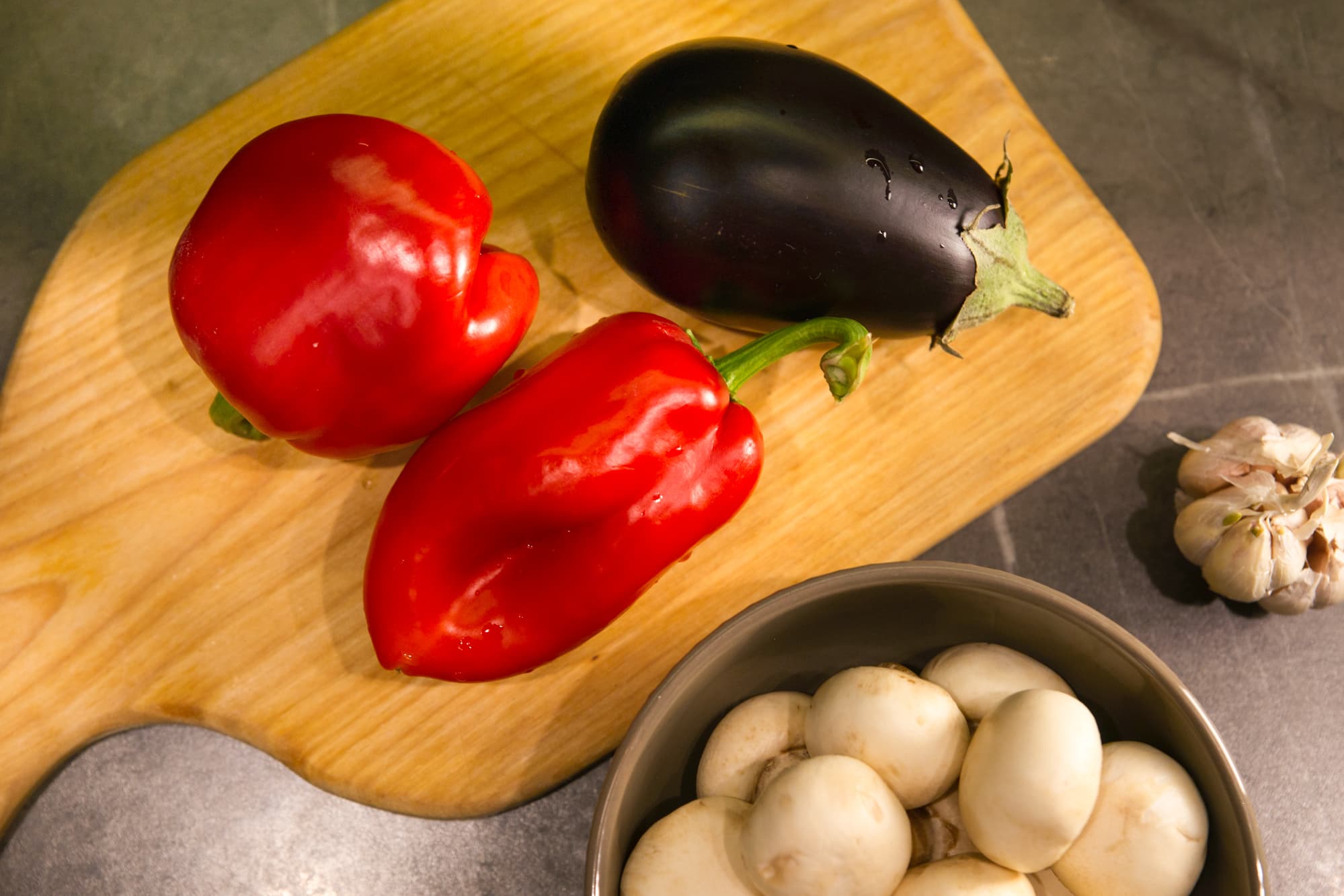 В следующий раз мы готовили на двух уровнях. В чашу на антипригарную решетку выложили шампиньоны с овощами, предварительно сбрызнутые маслом и присыпанные солью с черным перцем.