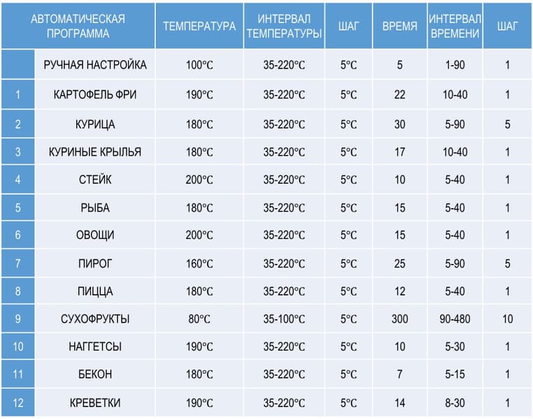 | Регулировка температуры приготовления | от 35 °C до 220 °C, с шагом 5 °C |