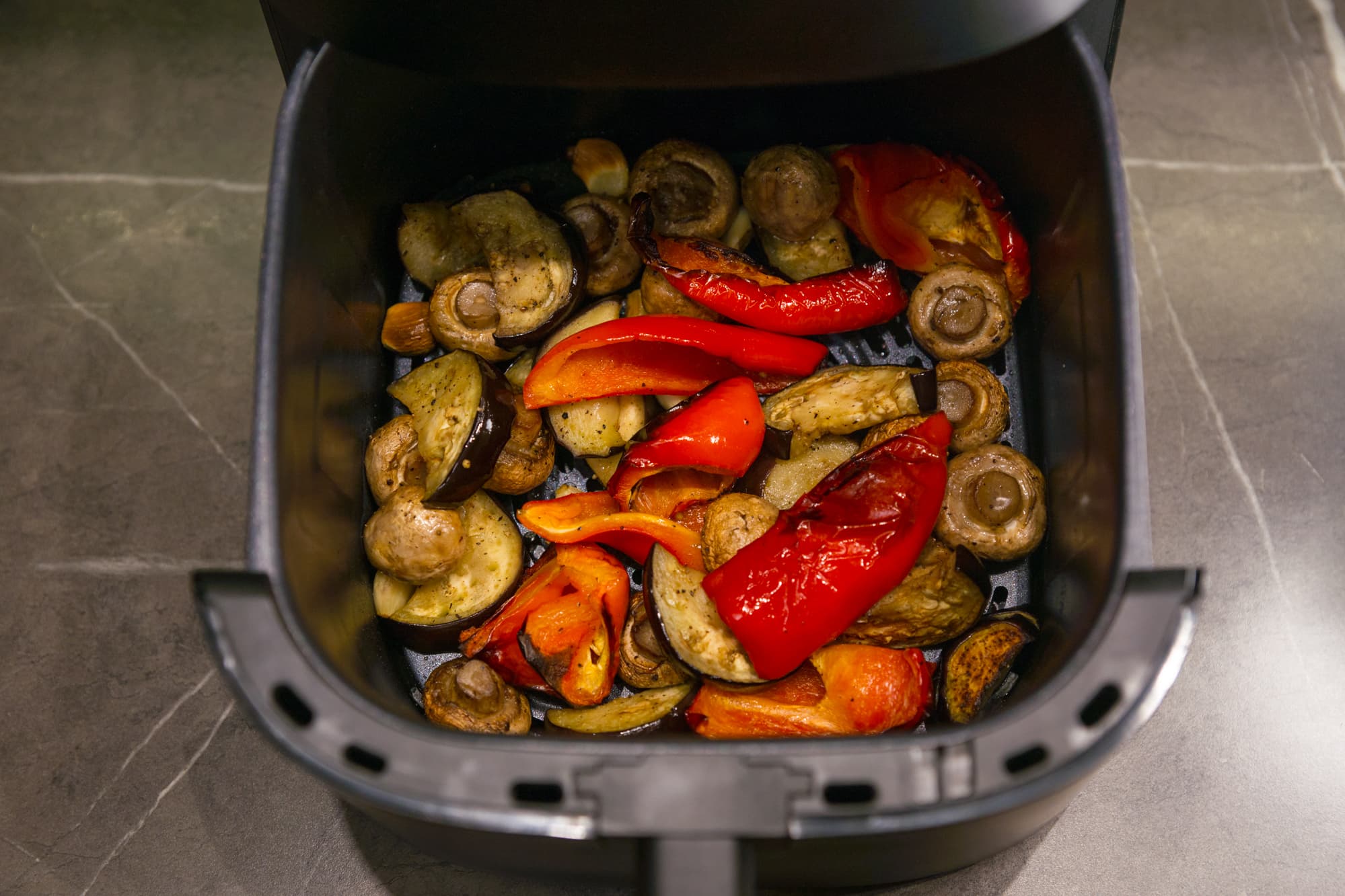 Установили чашу в камеру и включили режим Овощи с нагревом до 190 °C на 20 минут. Через 10 минут достали емкость и перемешали продукты.