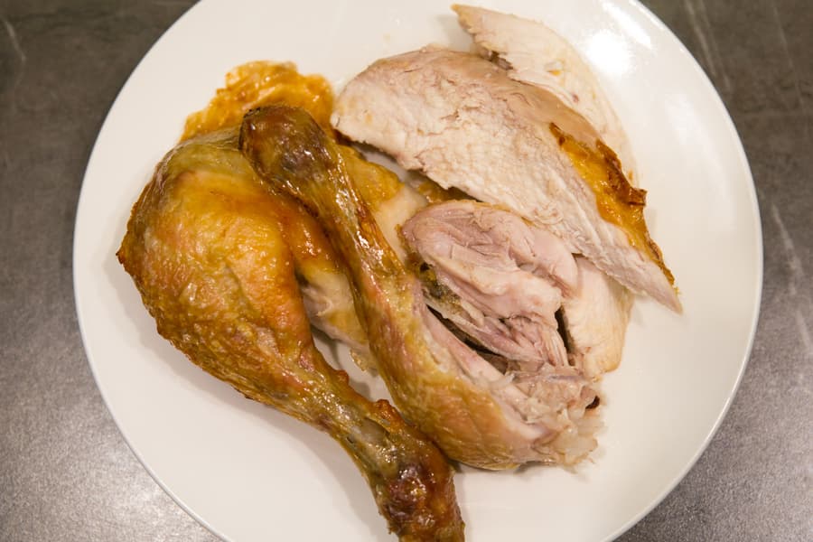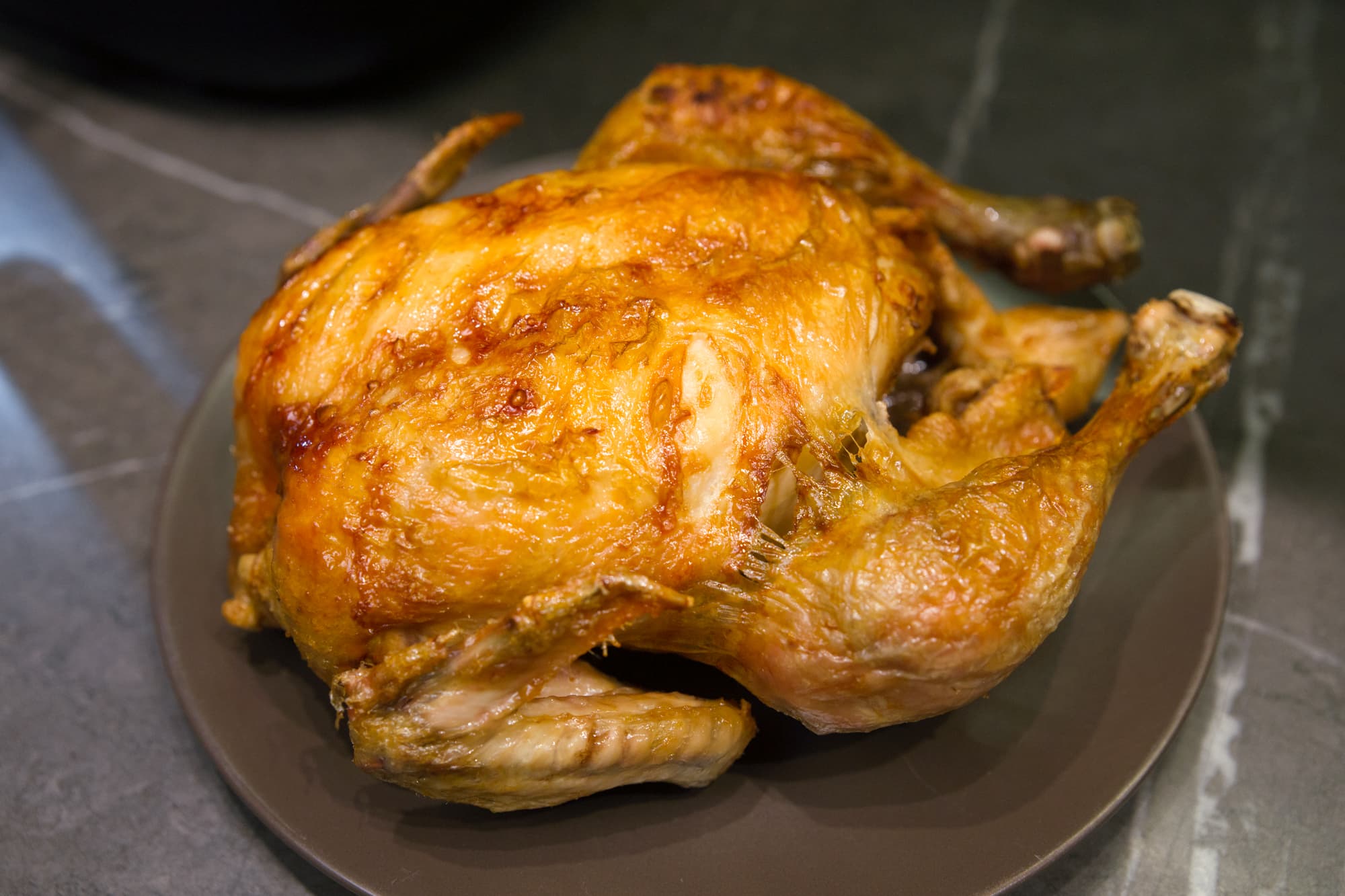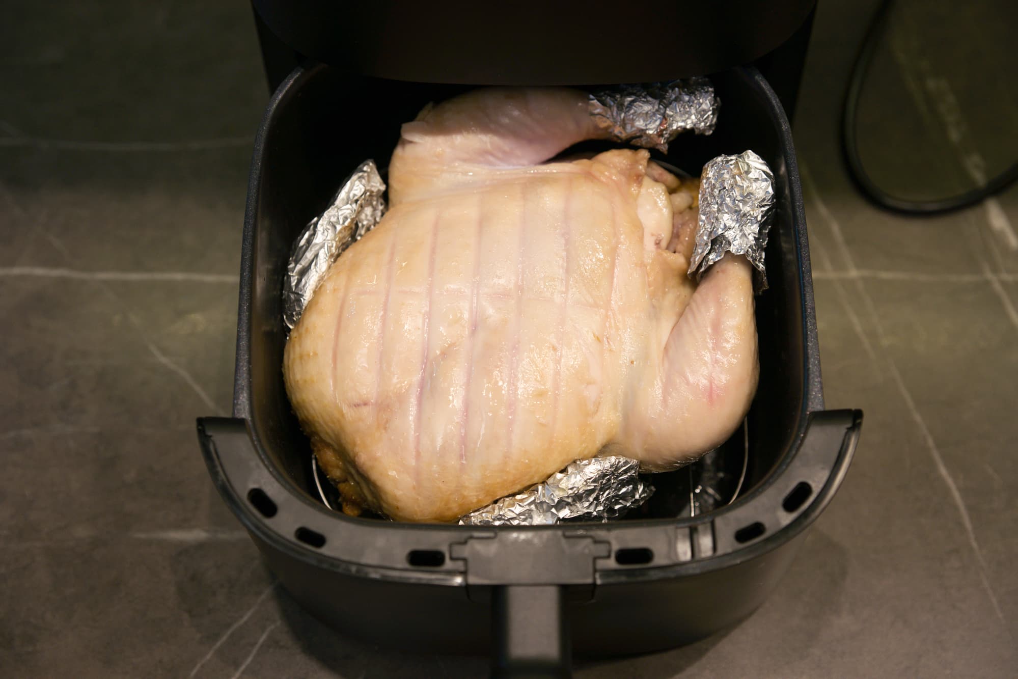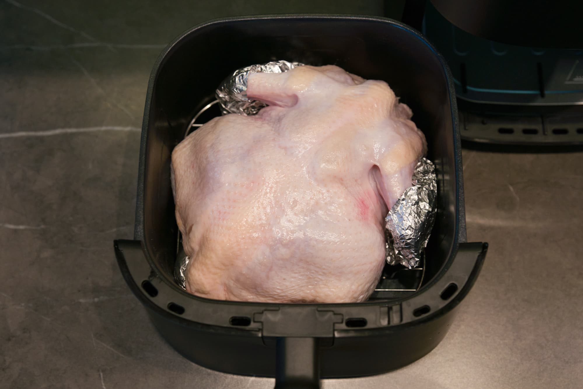 В этом тесте мы решили проверить, справится ли аэрогриль с запеканием целой двухкилограммовой курицы. Натерли птицу солью, смазали маслом, обернули ножки и крылышки фольгой, чтобы не пригорели, и опустили тушку в чашу, перед этим установив на дно металлическую решетку.