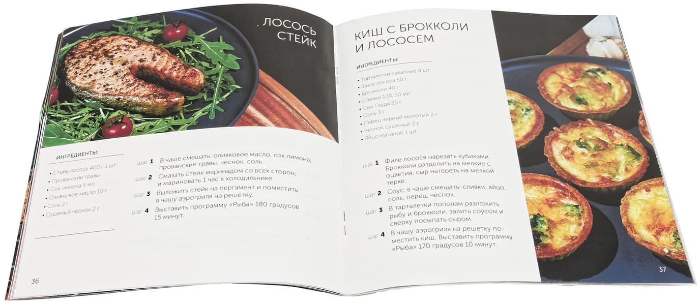К инструкции прилагается красочная книга с массой симпатичных рецептов самых разных блюд: из мяса, птицы, рыбы и морепродуктов, овощей и фруктов, рецепты салатов, закусок и даже выпечки.