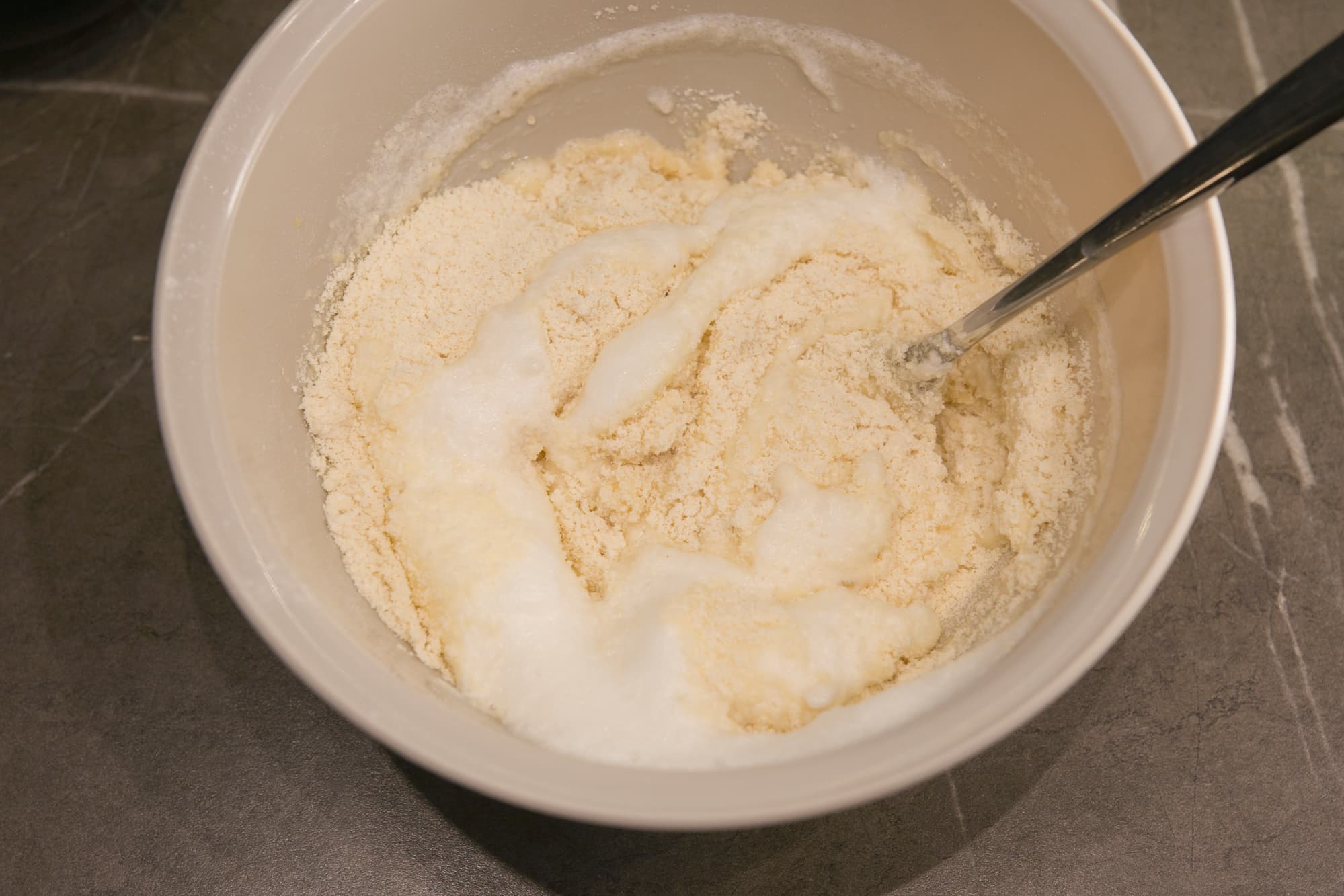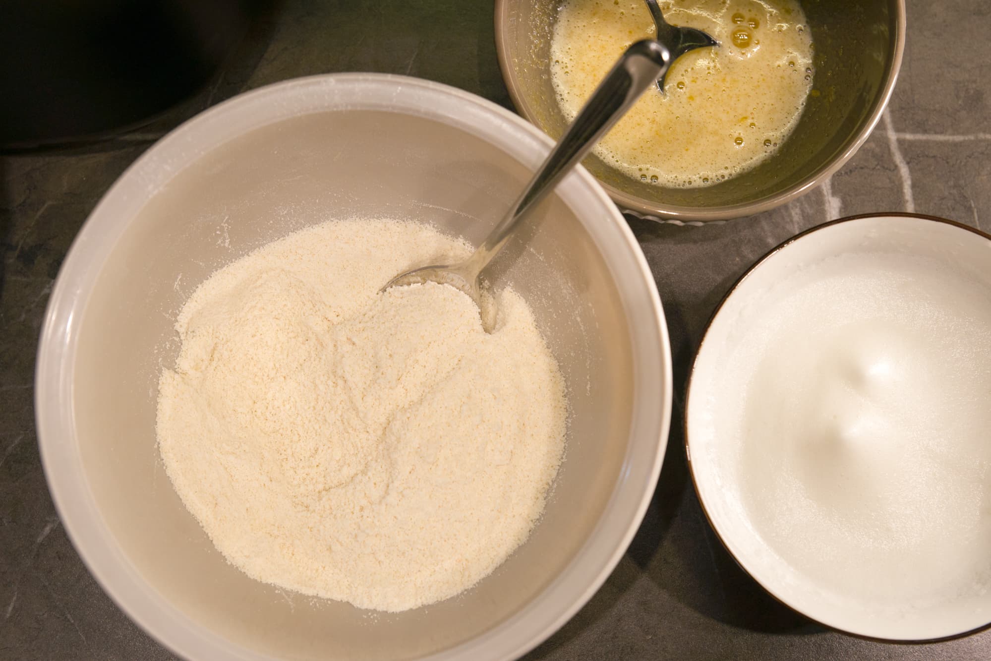 Смешали 140 г миндальной и 60 г пшеничной муки, растерли три желтка с 40 г обычного и 10 г ванильного сахара, отдельно взбили до мягких пиков 3 белка.