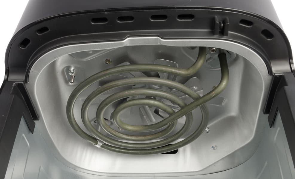 Нагревательный элемент находится под верхней панелью прибора. Над ним закреплен вентилятор конвекции.