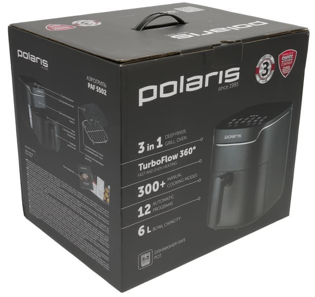 Polaris PAF 5502 приехал к нам в фирменной коробке из прочного картона с качественной цветной полиграфией. На упаковке размещены фотографии устройства, указаны основные преимущества и краткие технические характеристики. Для удобства переноски упаковка оснащена крепкой пластиковой ручкой.