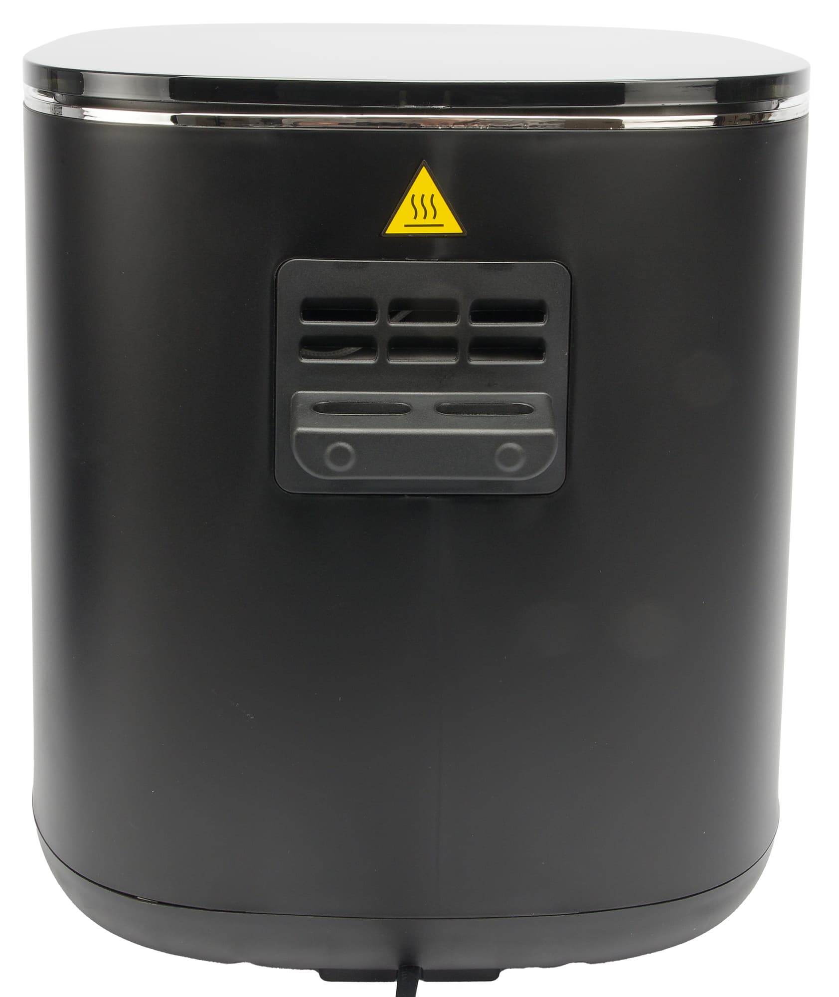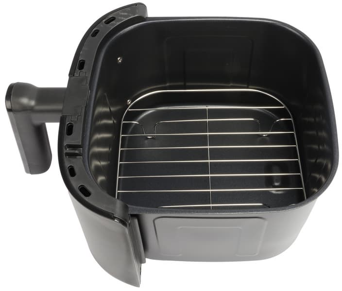 Взаимодействие с аэрогрилем оказалось комфортным, конструкция эргономична, управление удобно, понятно с первого взгляда и не вызывает никаких затруднений. Ни стенам, ни мебели вокруг, ни рукам пользователя жар от устройства не навредит — температура внешних поверхностей не способна обжечь даже при работе гриля на максимальном нагреве. Металлическая чаша, естественно, сильно греется в процессе и, извлекая ее из корпуса, ставить емкость прямо на стол не рекомендуется. Для проверки содержимого в процессе достаточно частично извлечь ее из корпуса и опустить на стол только переднюю часть, в этом месте металл закрыт термоизолированным пластиком. Ручка емкости всегда остается комнатной температуры.