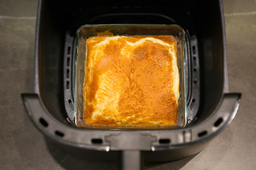 Взбитую венчиком смесь из 3 яиц и 150 мл молока вылили в стеклянную емкость, поставили ее в чашу и отправили в аэрогриль. Как советуется в книге рецептов, выставили программу Пирог. Параметры по умолчанию оставили без изменений: 160 °C и 25 минут. Результат порадовал.