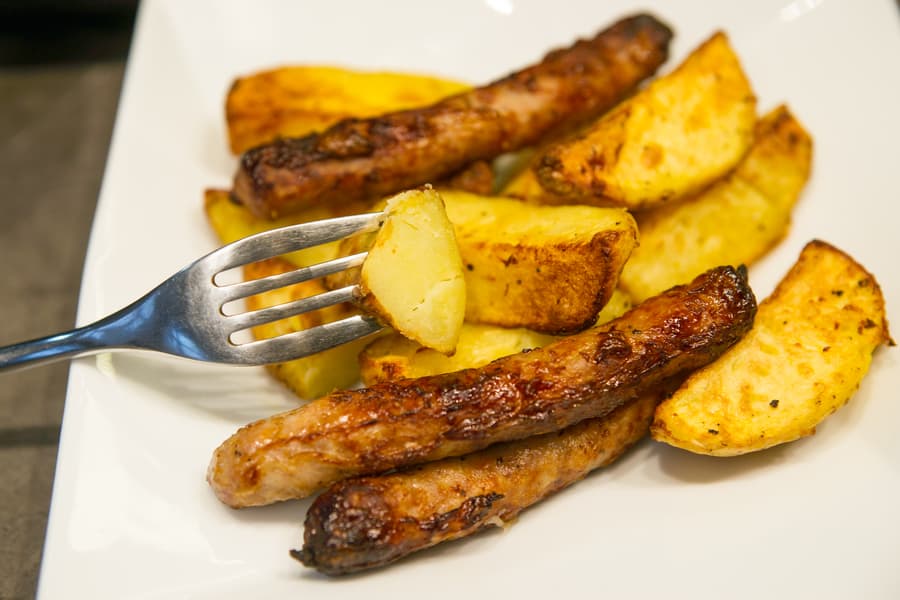 Крупный картофель нарезали на четвертинки, добавили растительное масло с солью и специями, перемешали и выложили в чашу, предварительно опустив на дно решетку. Выставили 200 °C на 40 минут. Минут через 20 достали чашу, убедились, что процесс идет неплохо, а картофель вовсю подрумянивается, перемешали дольки и поставили емкость обратно. За 15 минут до окончания еще раз вмешались в процесс — встряхнули содержимое чаши и добавили колбаски. По окончании цикла нас ждал равномерно приготовленный симпатично зажарившийся картофель и сочные, также хорошо поджаренные колбаски.