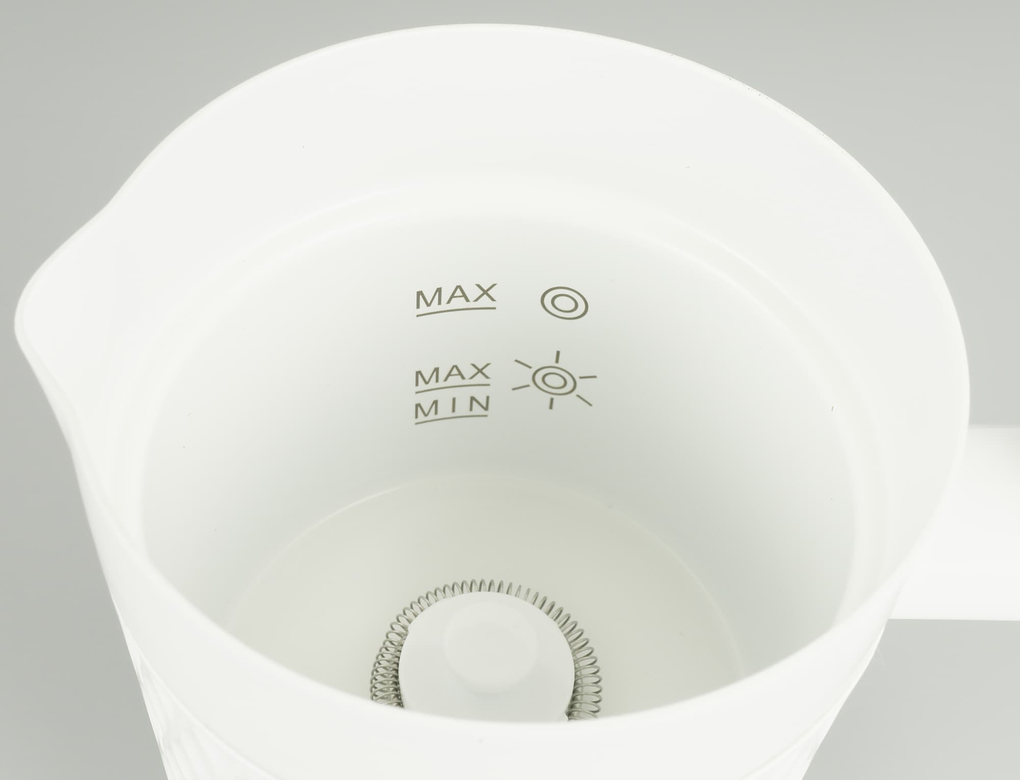 Внутренняя часть вспенивателя металлическая и покрыта антипригарным покрытием. Напротив ручки выделяется небольшой изгиб-носик. На боковых стенках нанесены отметки Max, соответствующие максимальному уровню молока для горячего вспенивания и подогрева молока, и отметка Min для минимального наполнения кувшина.