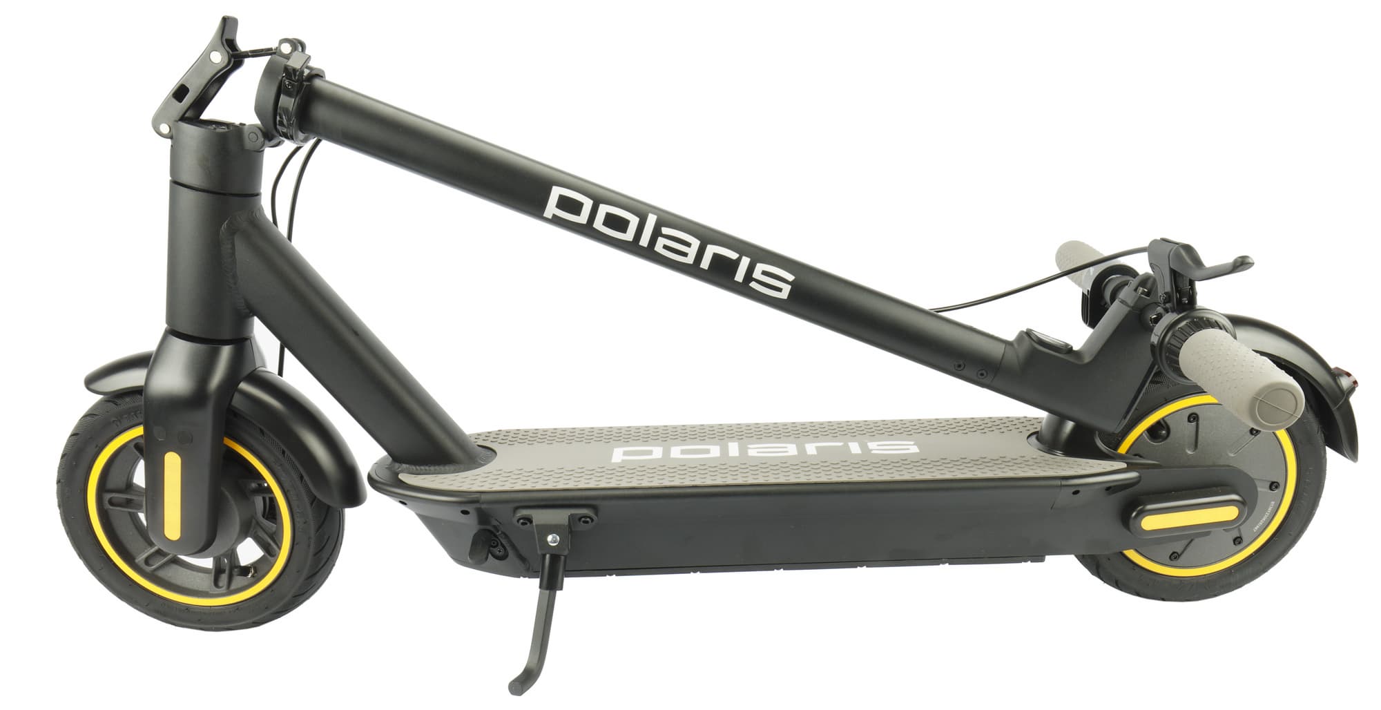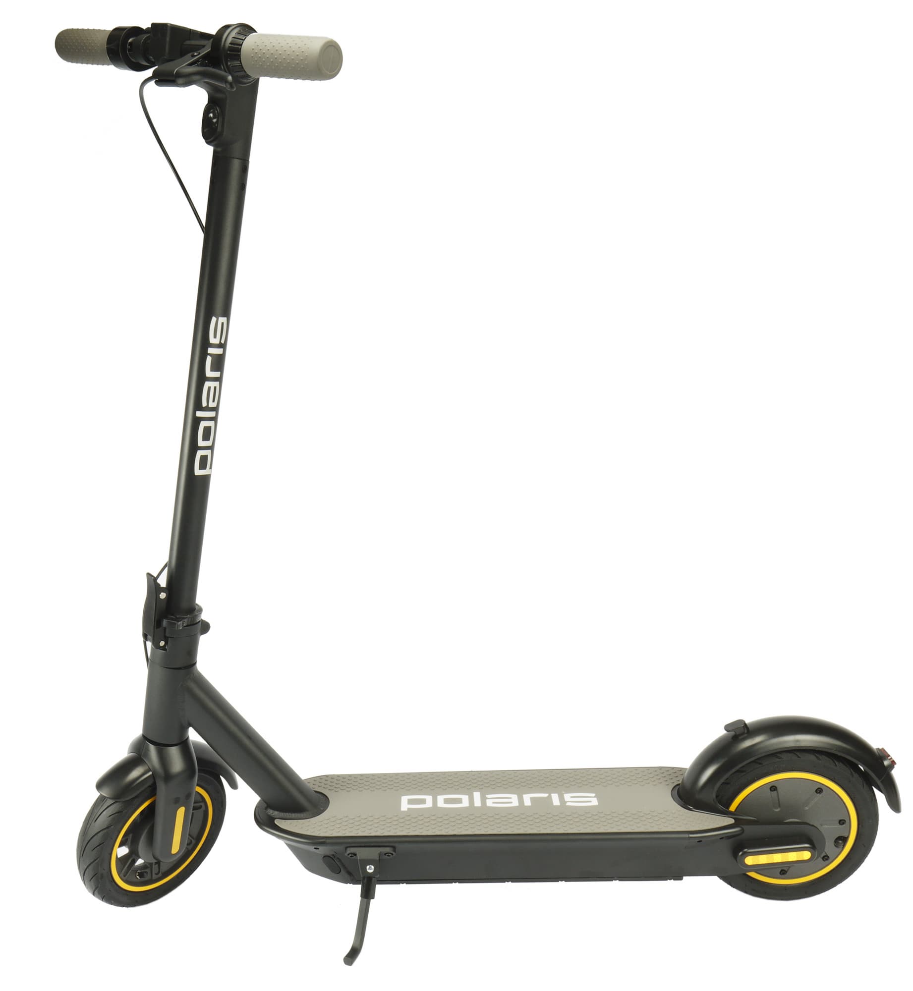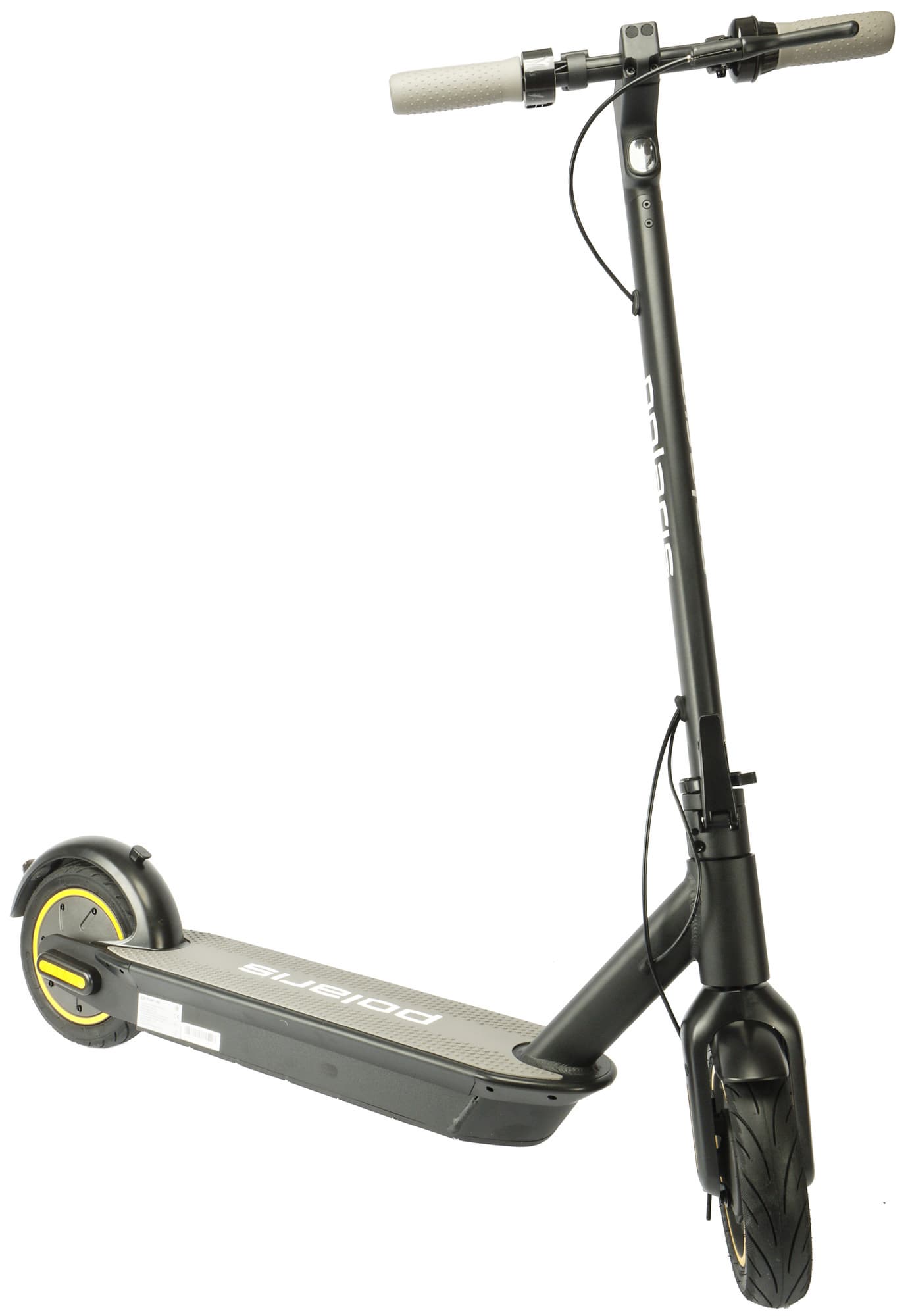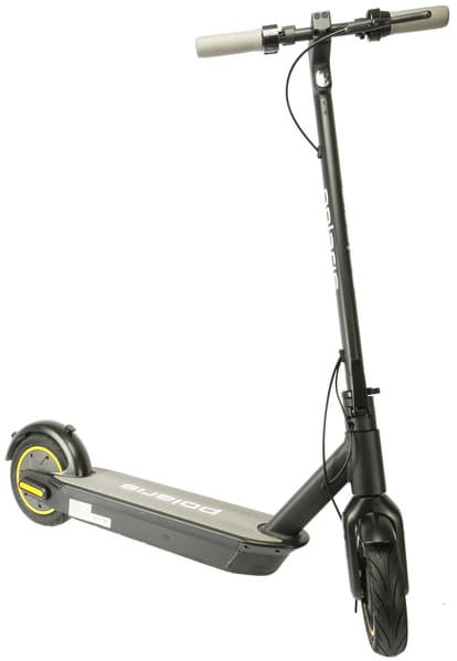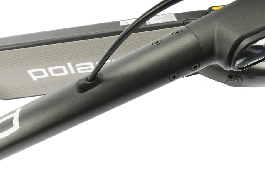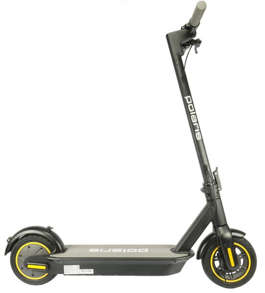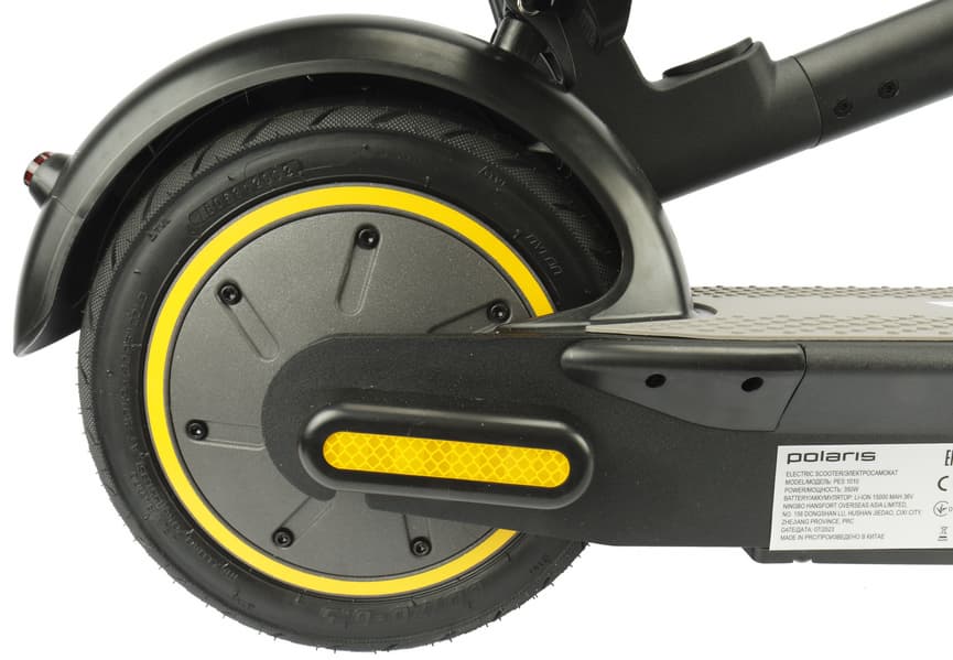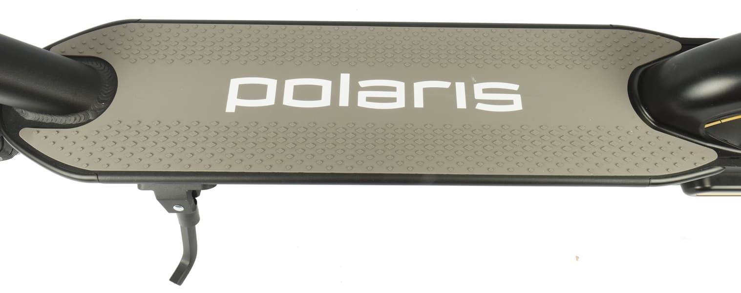 Polaris PES 1010 относится к заднеприводным самокатам. Электромотор мощностью 350 Вт расположен в заднем колесе. Там же прячется и электрический тормоз.