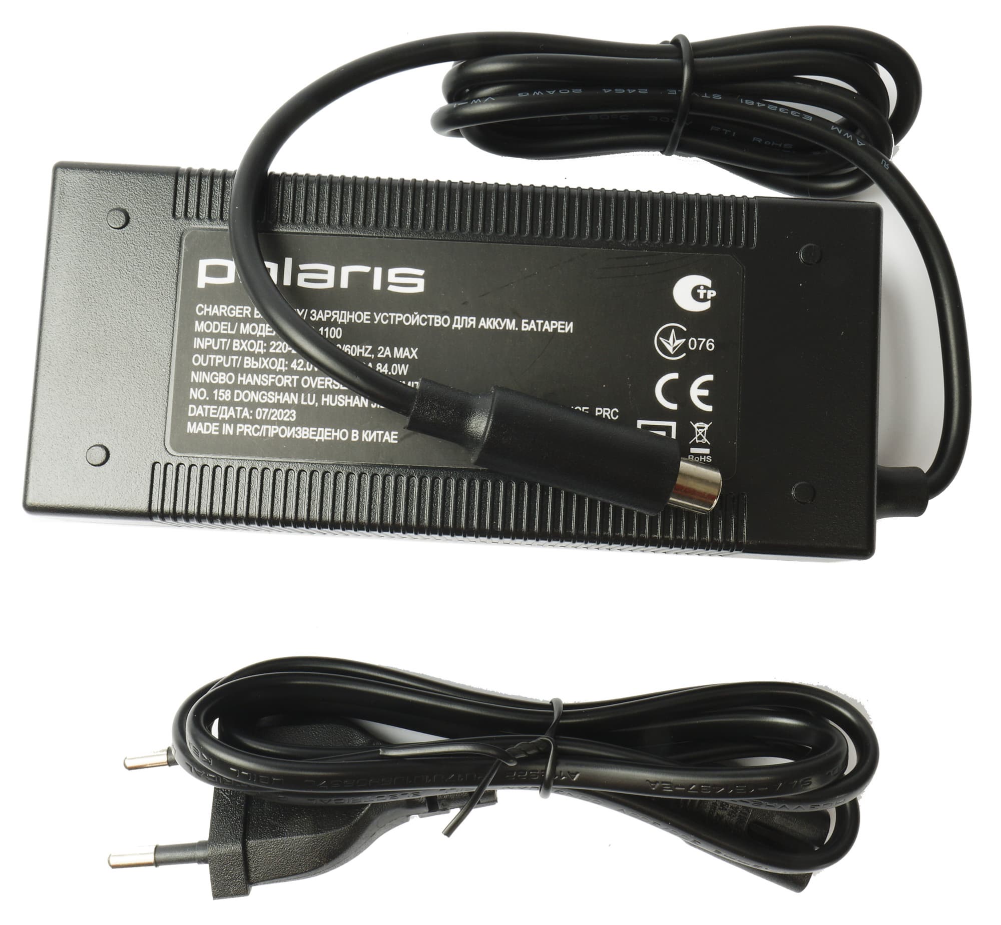 Зарядное устройство представляет собой довольно увесистый блок-адаптер, к которому подключается кабель с вилкой. Второй кабель (который подключается к самокату) зафиксирован. Общая длина двух кабелей составляет вполне комфортные 2,1 м. Отметим, что зарядный разъем тут не совсем стандартный. Признаться, мы не осведомлены, насколько он распространен в мире электросамокатов (снова будем рады комментариям читателей), однако в случае, если кабель будет поврежден, явно придется потратить некоторое время на поиск замены. Выходные параметры зарядного устройства — 42 В, 2 А (84 Вт).