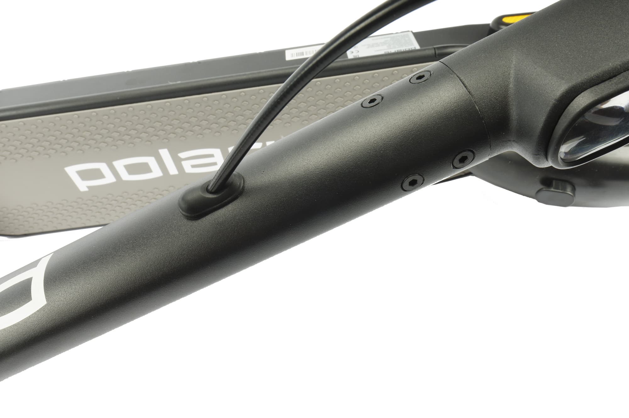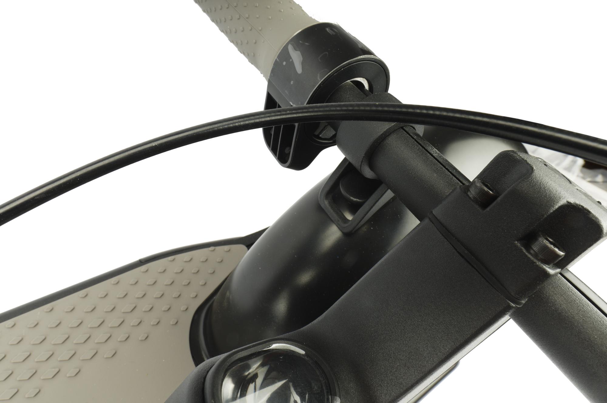 Стойка у нашего самоката металлическая, окрашенная черной матовой краской. Внутри стойки проходят провода, сообщающиеся с ручкой газа и приборной панелью. Также внутри частично проходит тросик тормоза. Для защиты от попадания влаги применяются резиновые заглушки (их нам пришлось немного выровнять, поскольку установлены они были слегка кособоко).