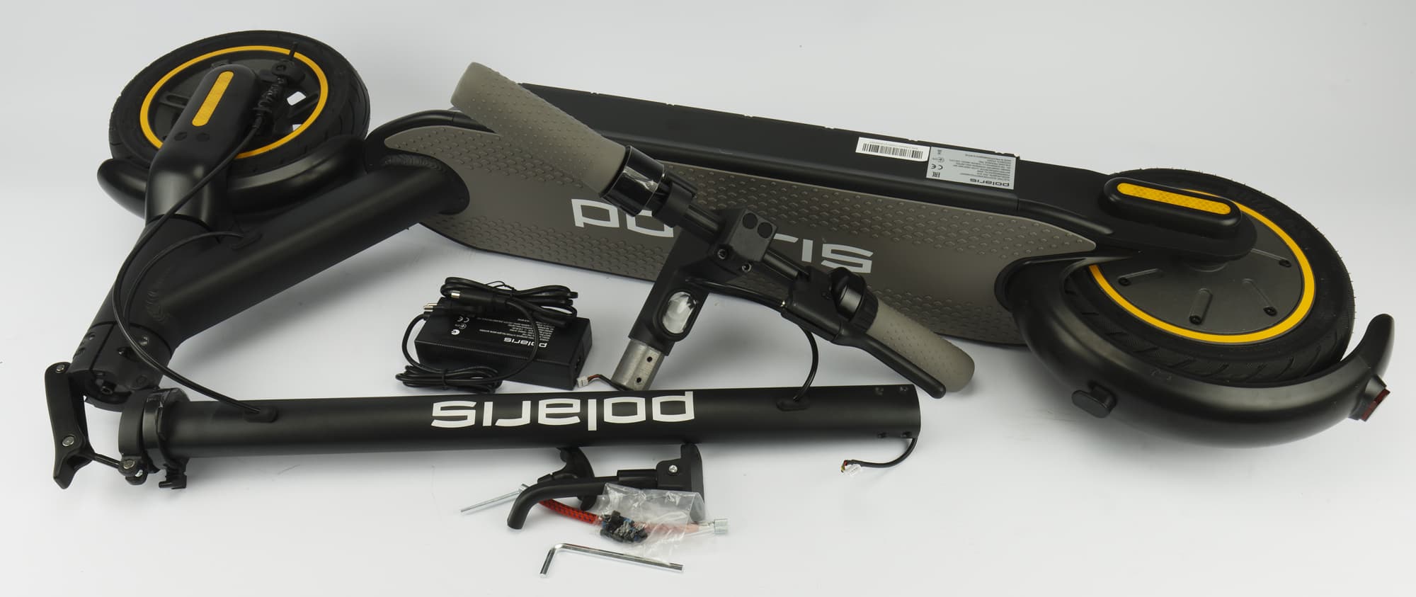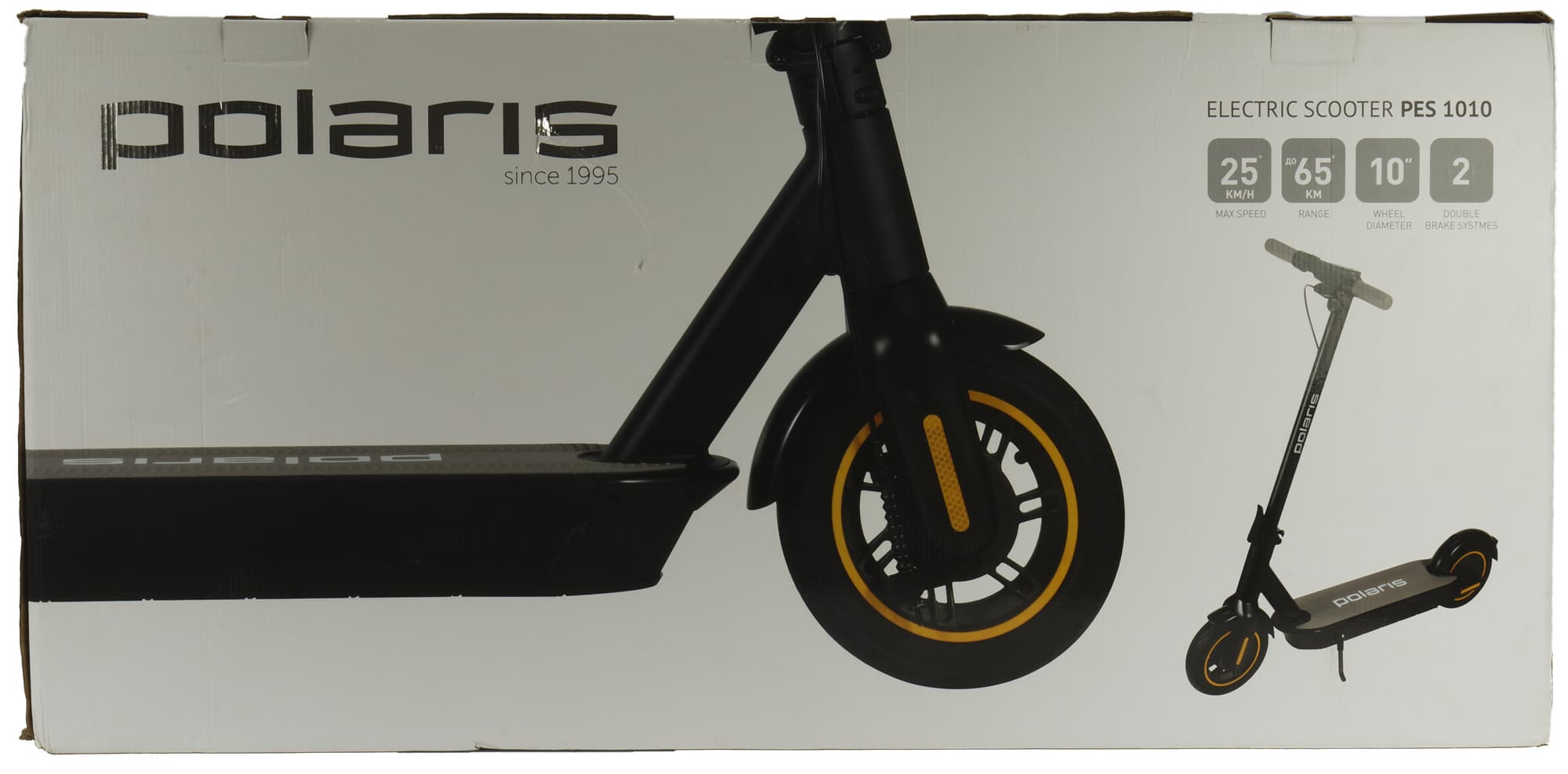 Электросамокат Polaris PES 1010 поставляется в объемной прямоугольной коробке. Убирать самокат обратно, скорее всего, не придется, но всё же упаковка выполнена более чем достойно. Полноценная печать, белый фон, «серебряный» логотип Polaris — все это создает наилучшее впечатление уже на этапе покупки.