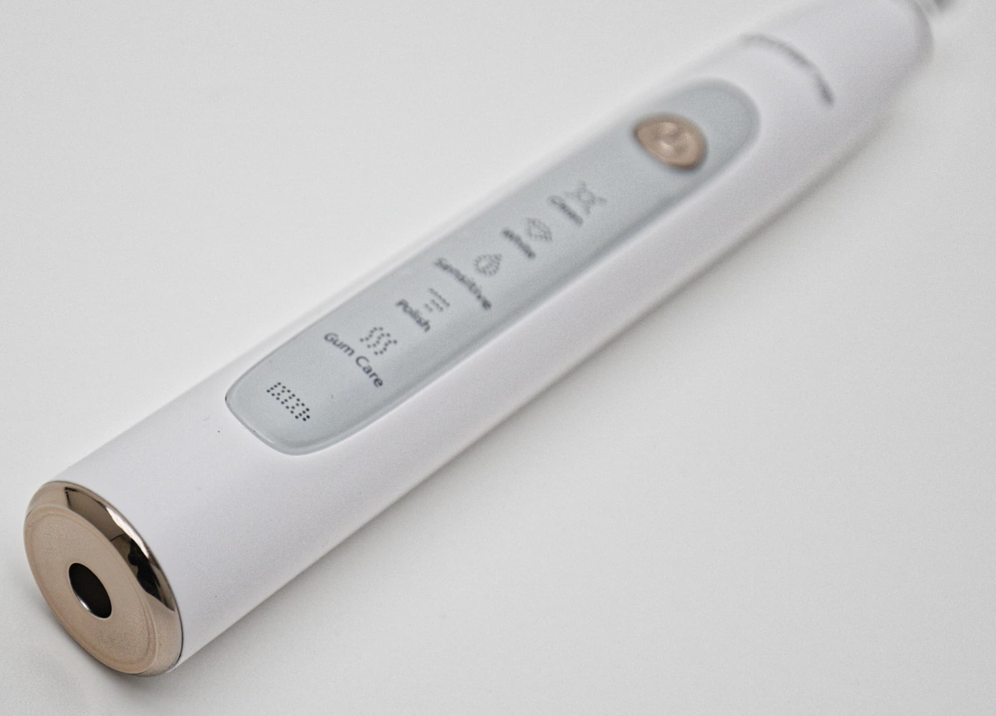 Для включения, переключения режимов и выключения у щетки служит одна достаточно крупная хромированная кнопка — не перепутаешь даже на ощупь. Под ней находятся светодиодные пиктограммы режимов с подписями на английском и значок уровня заряда.